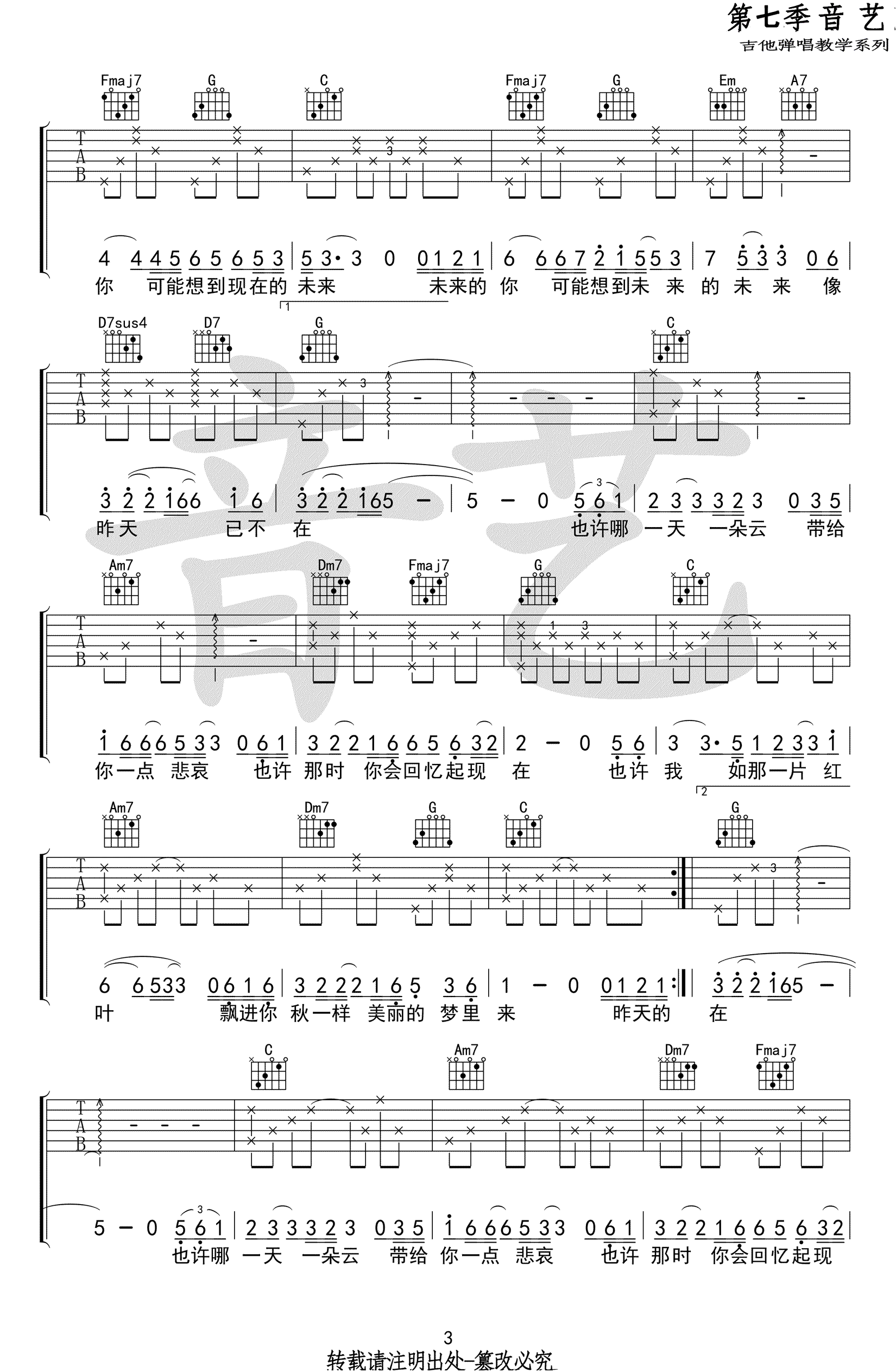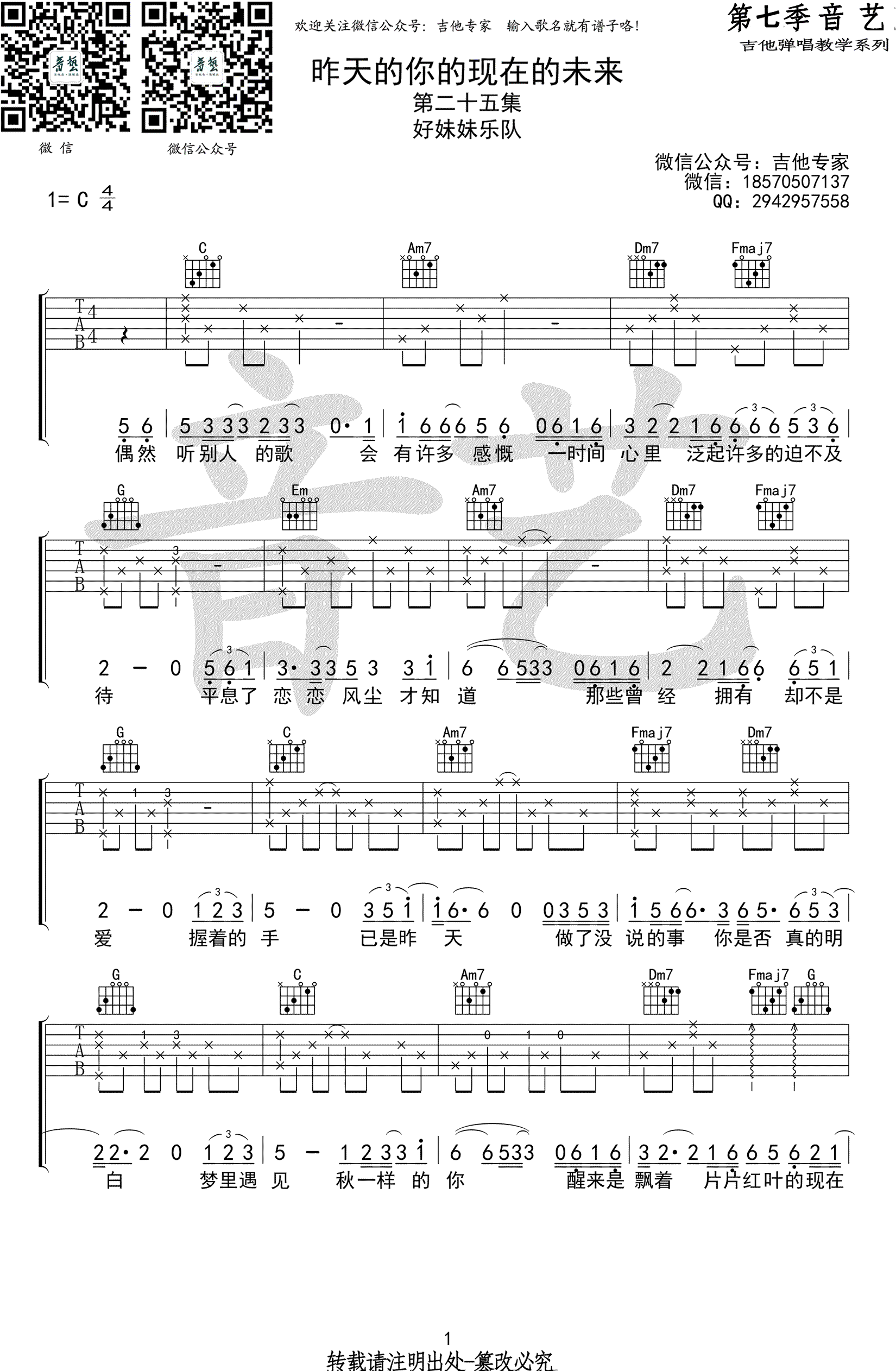 曲谱介绍: 昨天的你的现在的未来吉他谱,好妹妹乐队演唱,收录在《春生》专辑当中的一首抒情歌曲,《昨天的你的现在的未来》六线谱,完整高清版共四张图片谱,感谢艺音出品,91吉他谱网站推荐分享。 摇滚猫老师弹唱提示:这首好听的民谣歌曲被易烊千玺翻唱,受到更多的歌迷喜爱,歌曲原声结构其实很简单——1 6 4 5,大家在弹琴的时候不一定按曲谱的指法来,琴友们可以随意改编。