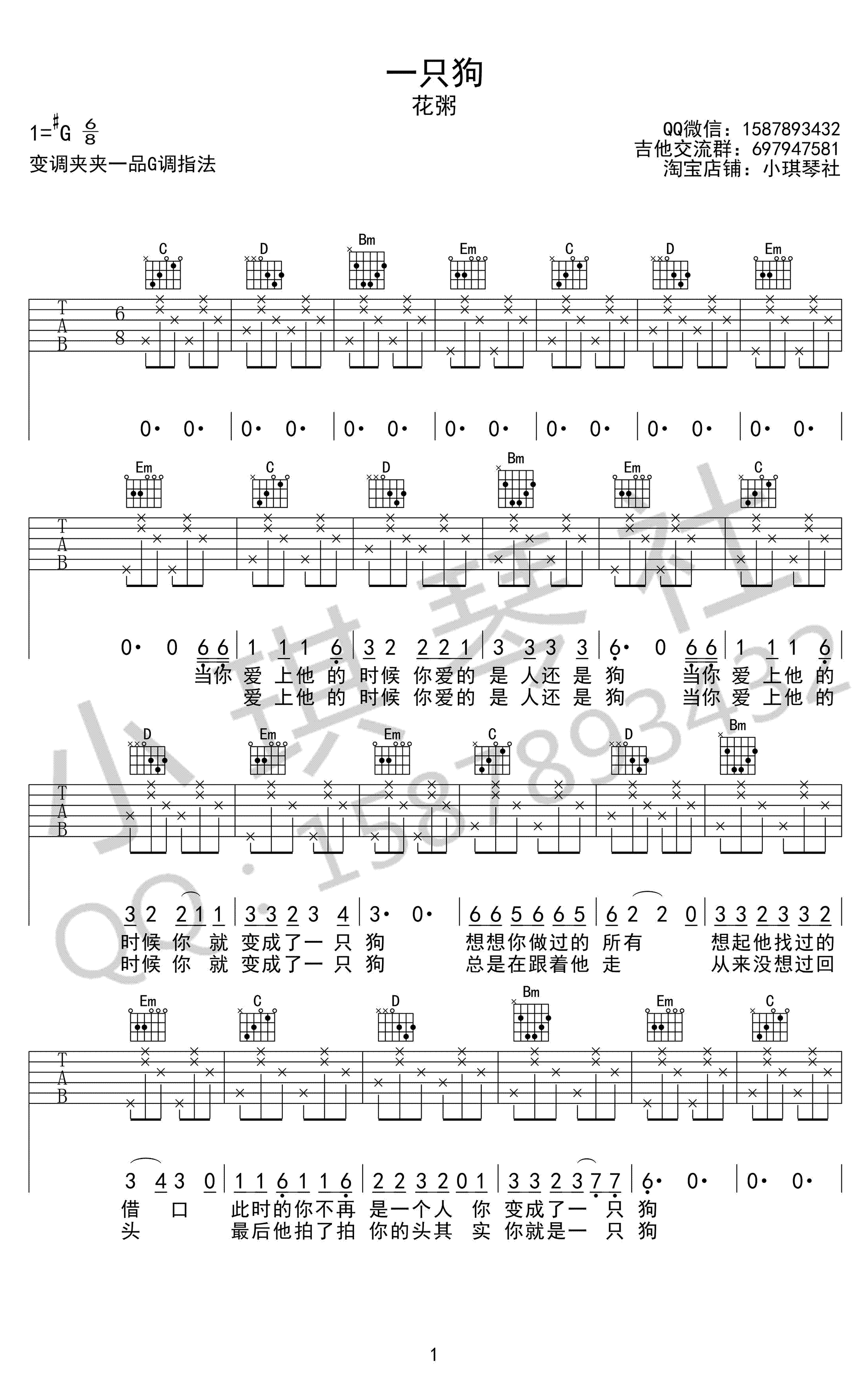 曲谱介绍: 花粥《一只狗》吉他谱,原调#G,变调夹夹一品,选用G调指法。花粥、四四的一首民谣吉他弹唱歌曲,一只狗六线谱,高清图片弹唱谱,感谢小琪琴社出品,91吉他谱网站上传。