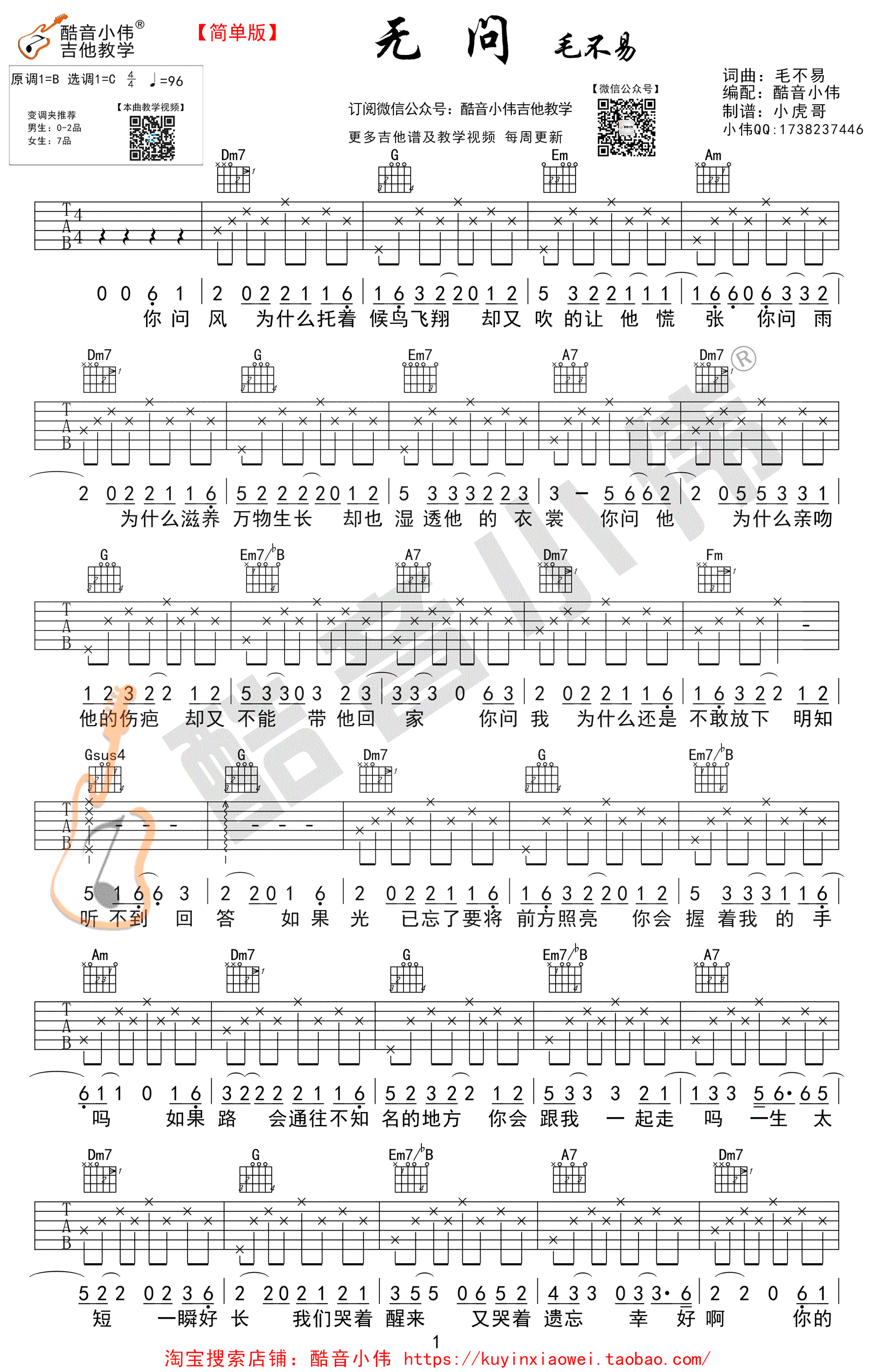 曲谱介绍: 毛不易《无问》吉他谱,C调简单版,原调B,变调夹推荐,男生0-2品,女生建议夹七品位置。无问六线谱,吉他弹唱高清图片谱。感谢酷音小伟编配出品,91吉他谱网站同时也准备了G调中级版的弹唱教学,琴友们可以选择参考练习。 电影《无问西东》宣传曲,用渲染力的歌词,跳动的音符将凝聚的故事情怀娓娓道来,告白的不止是《无问西东》,也是每一个你。