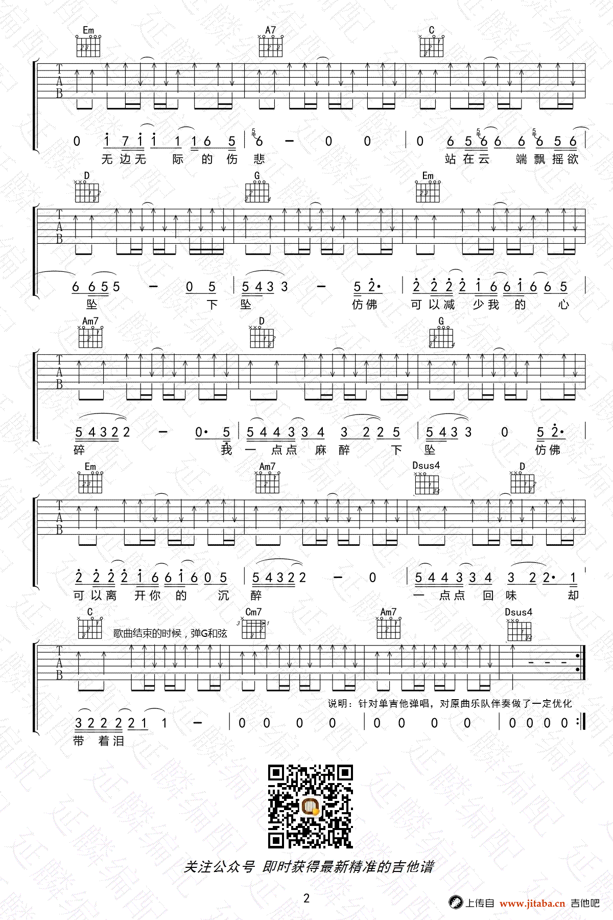曲谱介绍: 下坠吉他谱,汪峰演唱,G调指法,《下坠》吉他弹唱六线谱,一首比较冷门的歌曲,因为汪峰在湖南卫视《歌手》节目的演绎而得到歌迷的关注。曲谱根据歌手live版改编,感谢齐歌吉他延麟老师编配分享,91吉他谱网站为琴友们上传收藏。 这首歌曲旋律与旋律之间空隙比较大,这给了主音吉他加花制造了不少的机会,这也是学习的时候应该注意到的地方。琴友们平时就要多积累素材,当素材积累够多了,你把这些素材拼接,那就形成自己的东西了。
