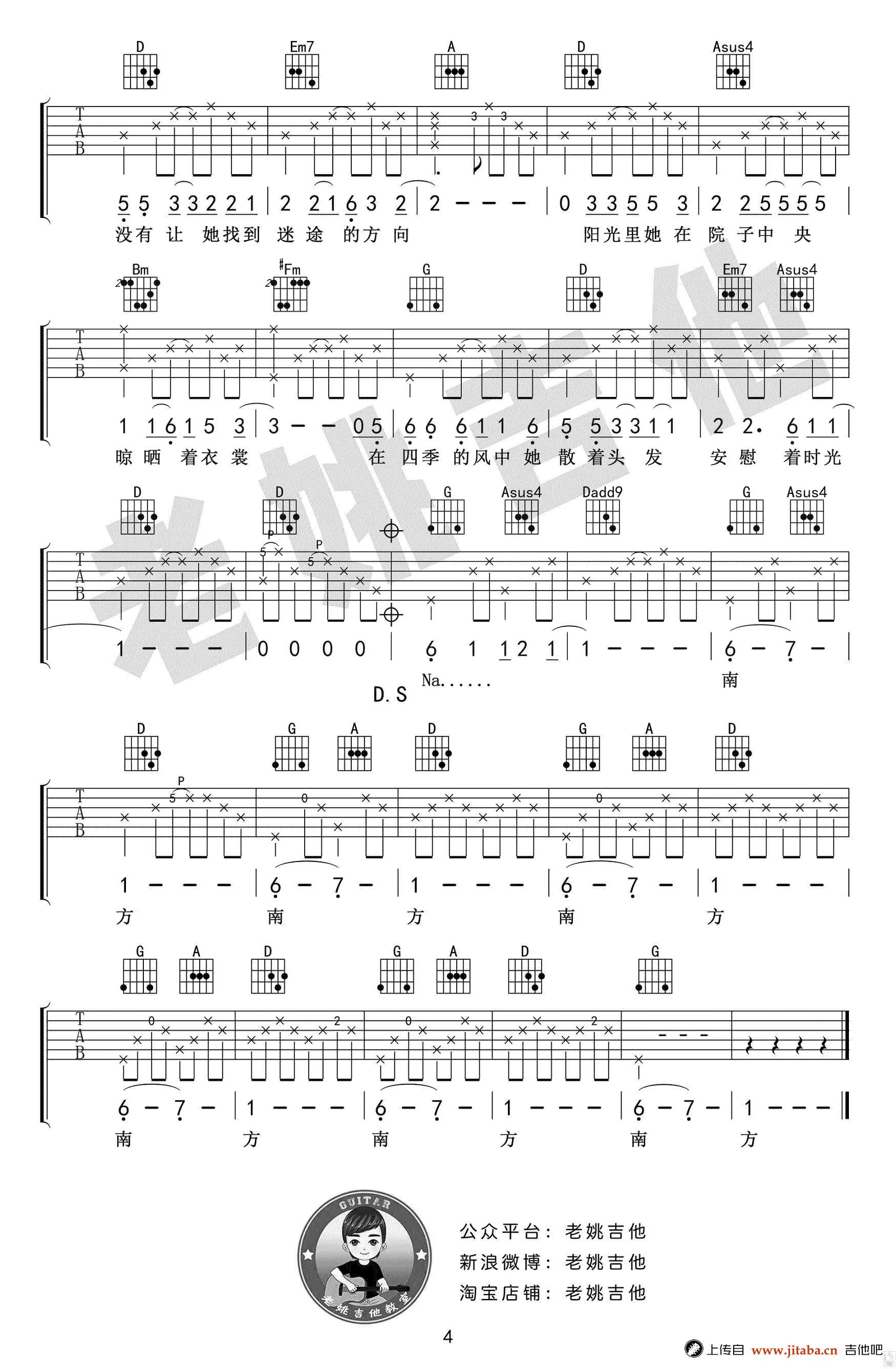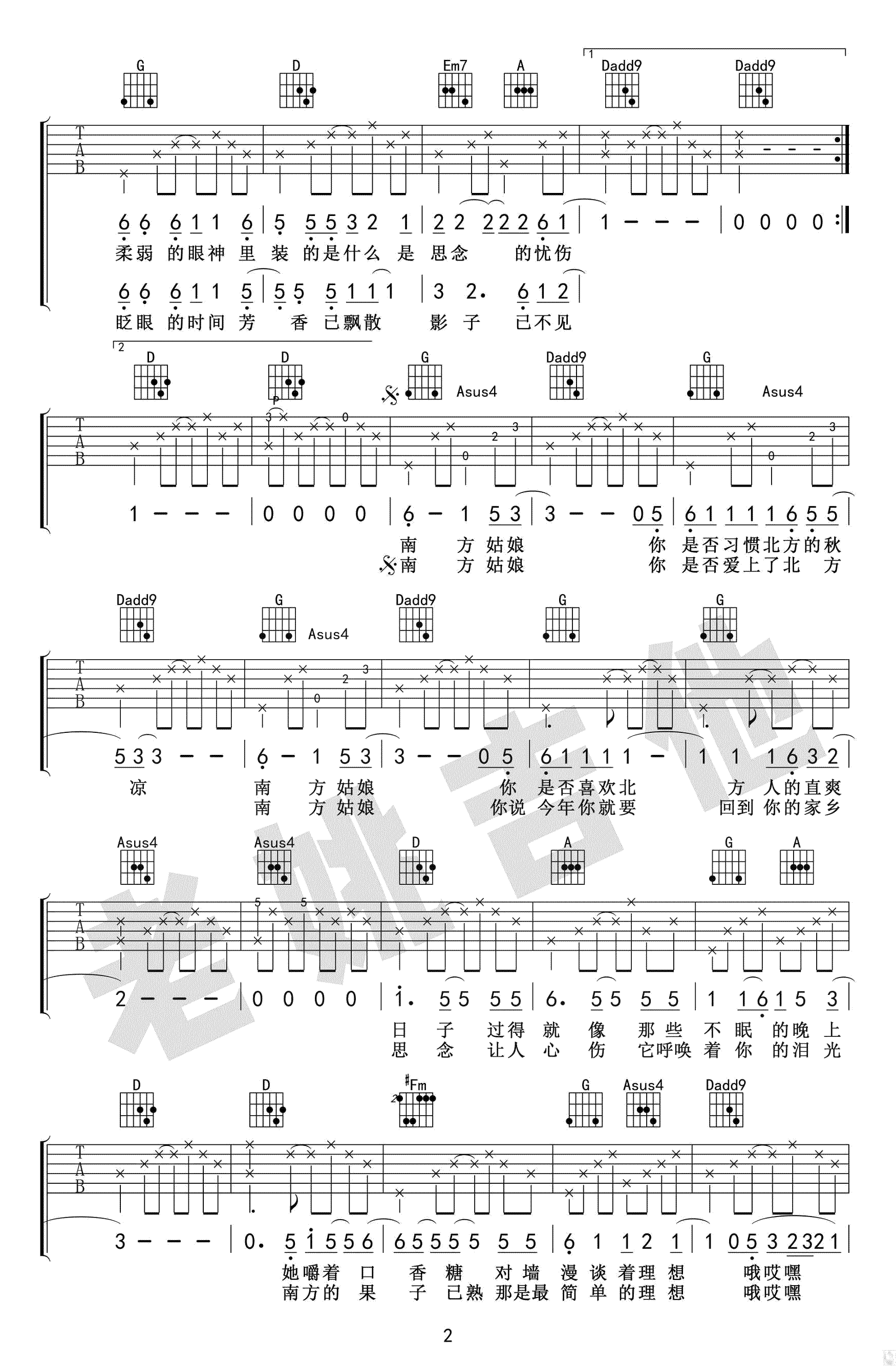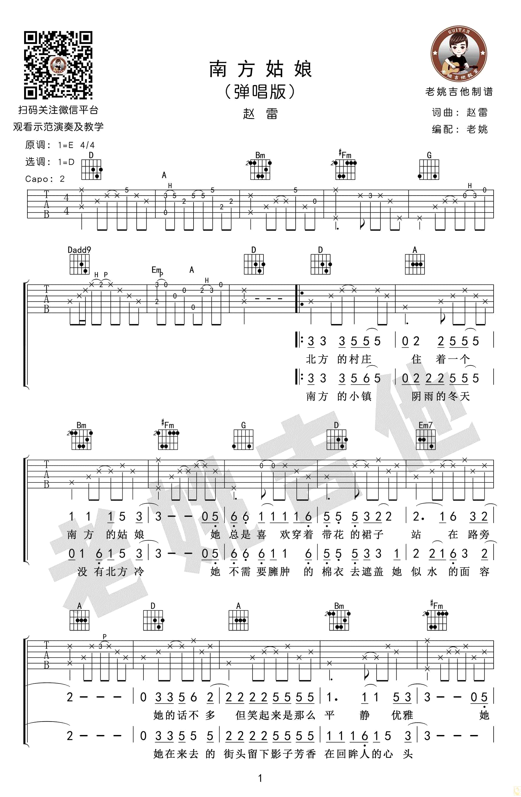 曲谱介绍: 南方姑娘吉他谱,弹唱版,高清图片谱共四张谱例,赵雷的经典代表歌曲,南方姑娘六线谱,原调E,选调D,CAPO夹二品。感谢老姚吉他编配出品,91吉他谱网站推荐分享。随谱附上《南方姑娘》吉他弹唱教学视频。