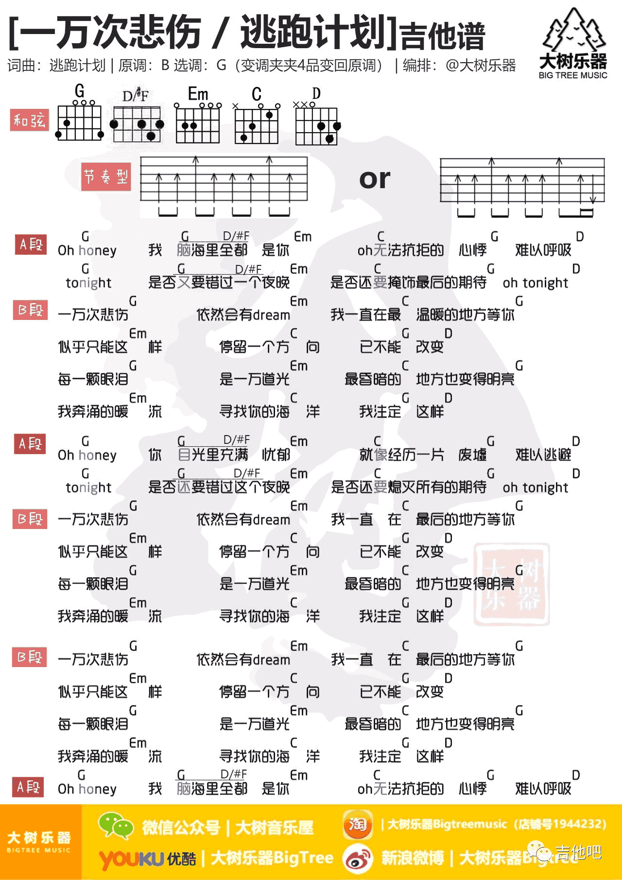 曲谱介绍: 一万次悲伤吉他谱,逃跑计划乐队演唱,选调G,变调夹夹四品,一万次悲伤吉他弹唱谱,和弦+节奏型高清图片谱,这首歌以扫弦为主。感谢大树乐器编配出品,琴友们参照老师的吉他弹唱教学视频练习。