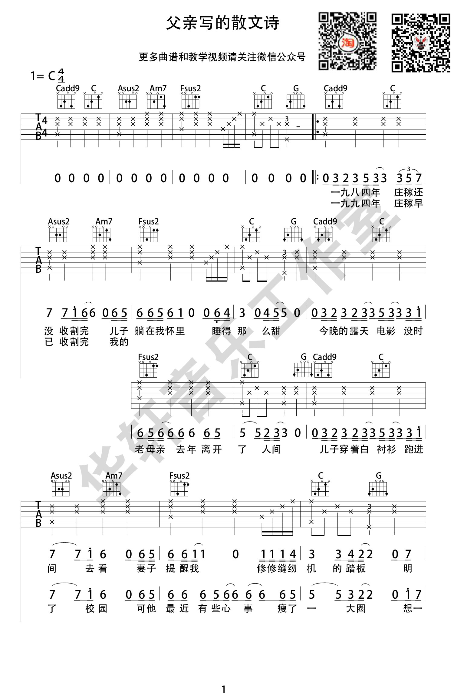 曲谱介绍: 父亲的散文诗吉他谱,李健演唱,C调指法,高清弹唱谱,父亲写的散文诗六线谱,完整版共四张图片谱例。感谢华轩音乐工作室出品,91吉他谱网站上传。 许飞作曲,董玉芳作词的一首感人肺腑的歌曲,触碰到我们心底最柔软的地方,每次听到这首歌都忍不住眼眶湿润,这首歌讲的不是一个人的父亲,而是所有人的父亲,那个不善言谈,却一直默默爱着我们的父亲。