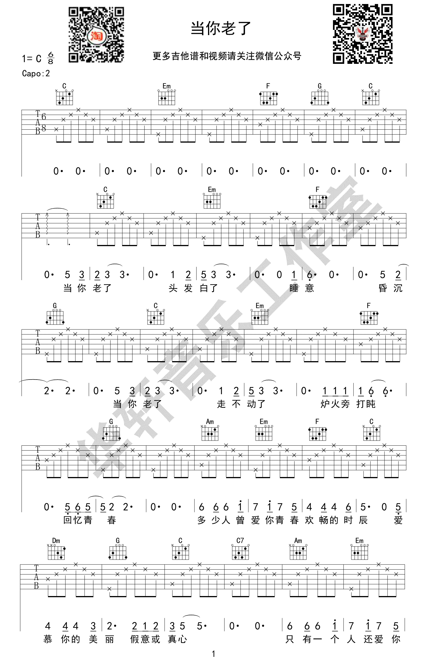 曲谱介绍: 当你老了吉他谱,赵照演唱,C调弹唱谱,Capo夹二品。当你老了六线谱,高清图片谱。华轩音乐工作室编配出品,91吉他谱上传推荐。 这是对爱尔兰诗人叶芝的同名诗作改编而成的歌曲,成为赵照一首极具代表性的民谣作品,内敛朴素的意境,给哀婉的情诗被赋予了新的内涵,感动了无数人。