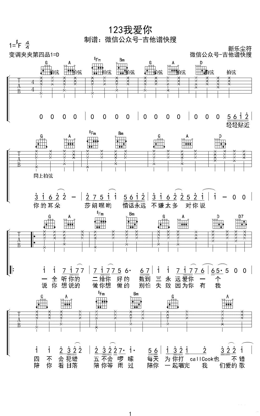 123我爱你吉他谱 - 新乐尘符 - 吉他弹唱谱