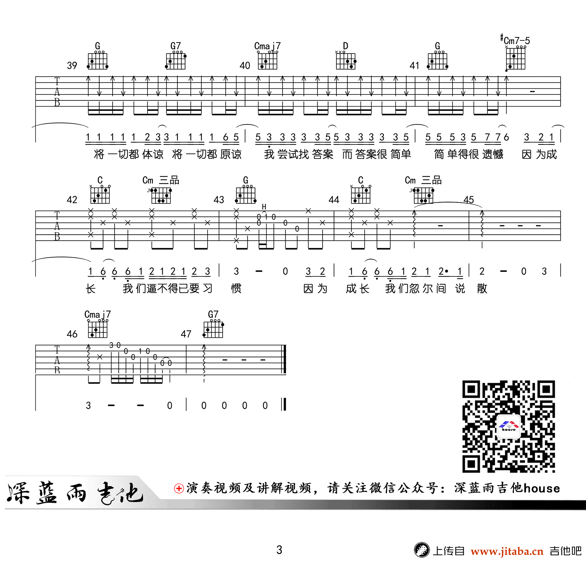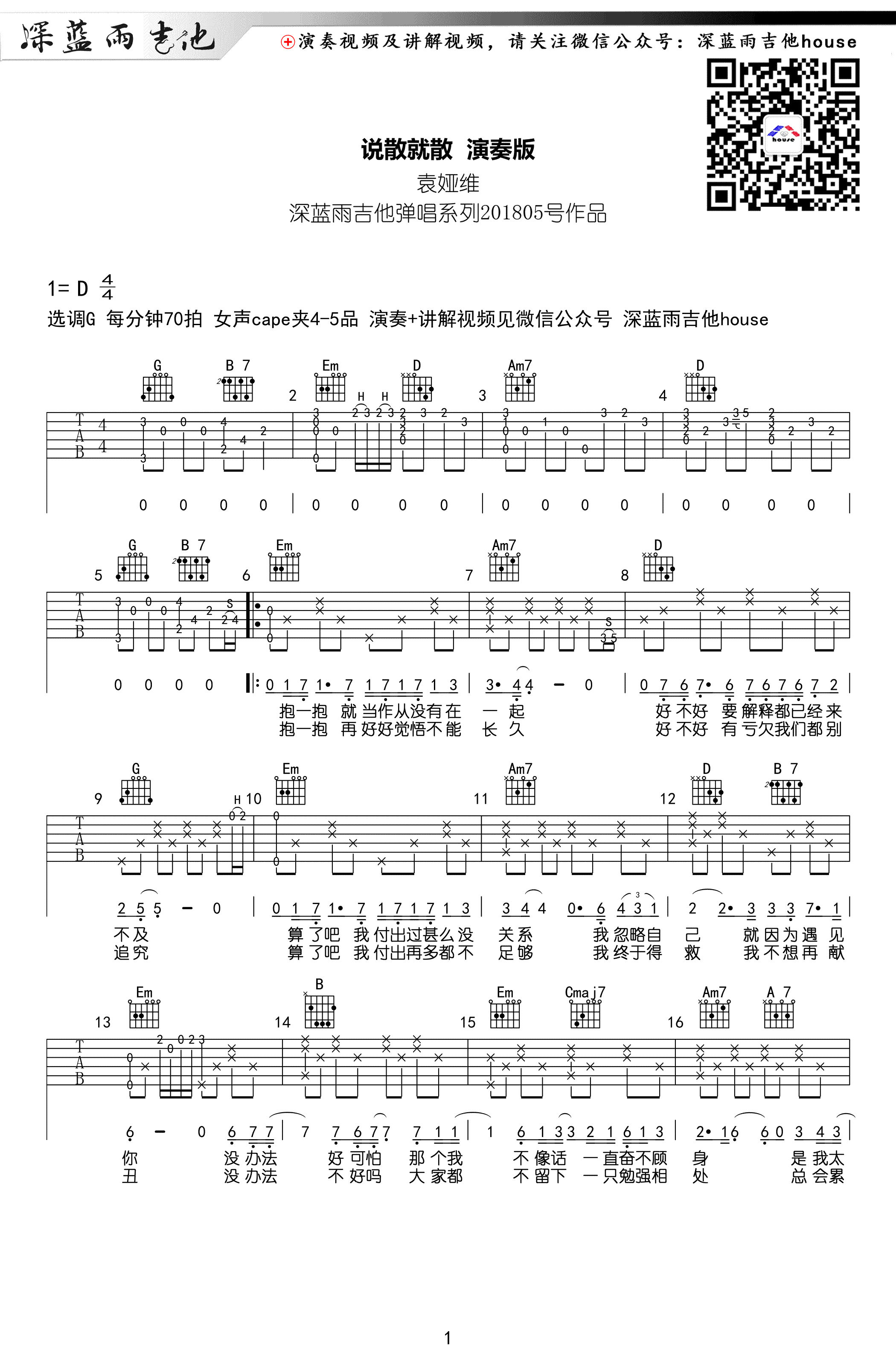 曲谱介绍: 袁娅维《说散就散》吉他谱,G调指法编配,女生变调夹4-5品,三张高清弹唱图片谱。说散就散六线谱,深蓝雨吉他编配出品,91吉他谱网站推荐上传。 热映电影《前任三》主题曲,JC陈咏桐原唱,一首让人单曲循环的歌曲,哭红了多少人的眼框,唱出了自我的救赎,让人回忆起最疼最扎心的情感,“因为成长,我们忽尔间说散就散”懂词的无奈, 懂歌心酸 ,可是谁懂深夜想念她/他时的无奈和悲哀。