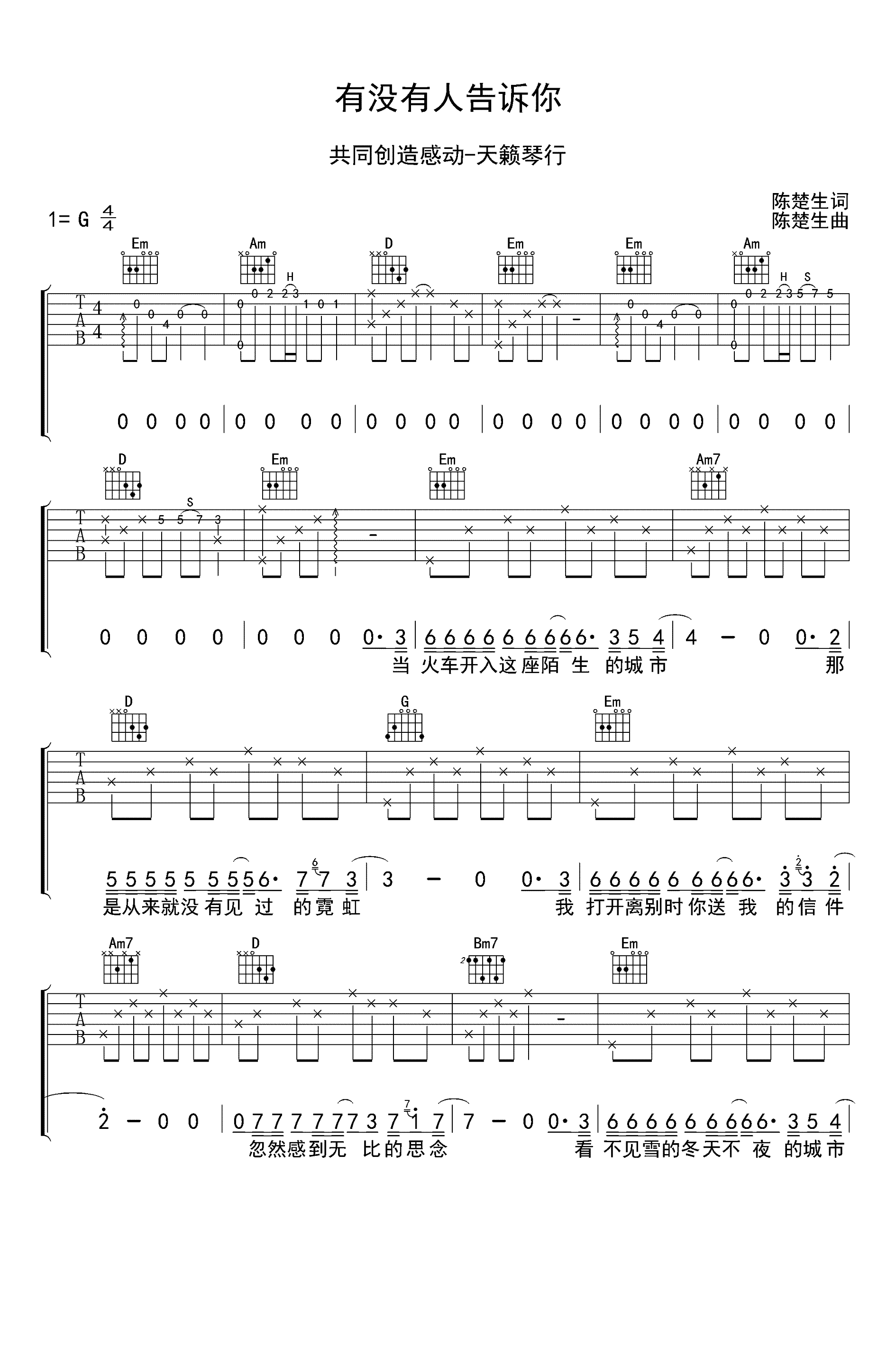 曲谱介绍: 有没有人告诉你吉他谱,G调指法弹唱谱,陈楚生演唱的一首经典代表歌曲,有没有人告诉你六线谱,三张高清图片谱,感谢天籁琴行出品,本曲谱借鉴了网上指间吉他的编配,把主旋律重新进行了修正。
