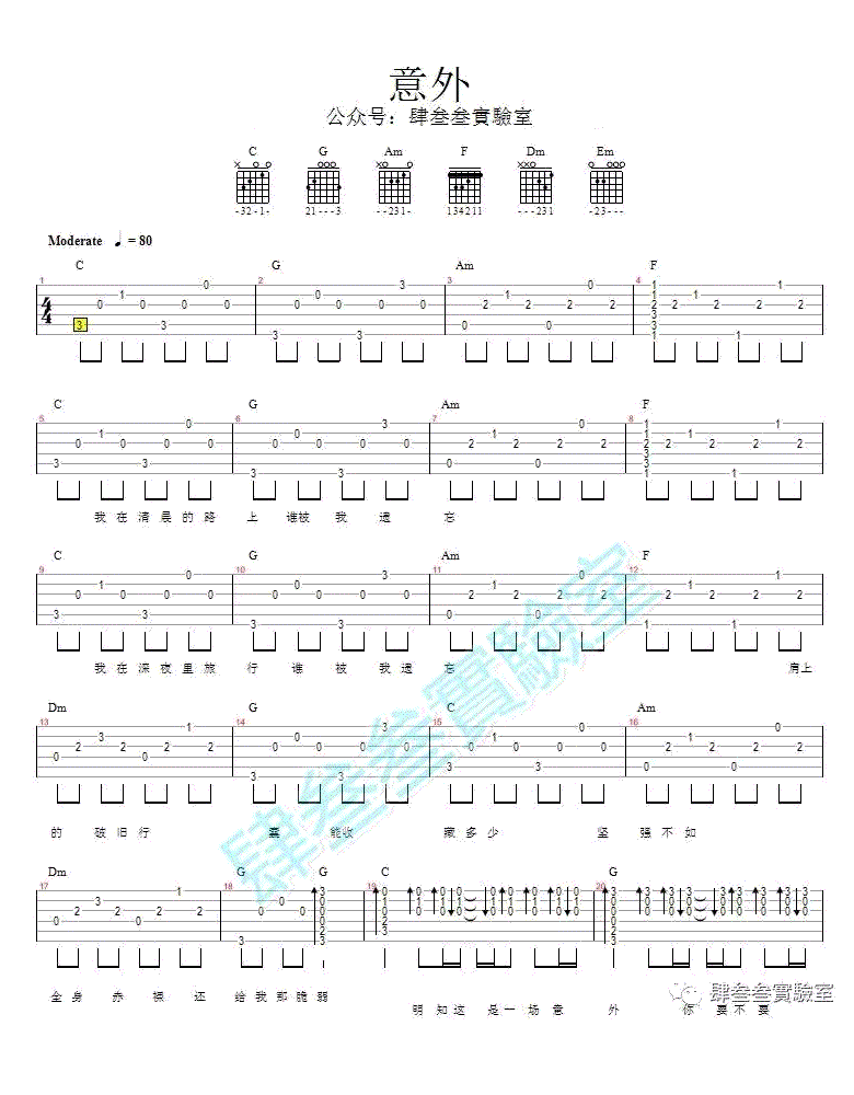 曲谱介绍: 薛之谦《意外》吉他谱,六线谱编配,这是一首以背包旅行展开的歌,旋律交织出公路电影般的氛围,呈现歌词中所写,明知是意外,也要闯一闯,哪怕赤身露体,也要有直面脆弱的勇气。 网上几乎只有和弦谱,或者是ukelele谱,几乎没有这首歌的六线谱。感谢四三三实验室综合所有的资料改编,歌词可能有对的不完美的地方,C调的,和弦走向大概是 1564 2516。谱如下: