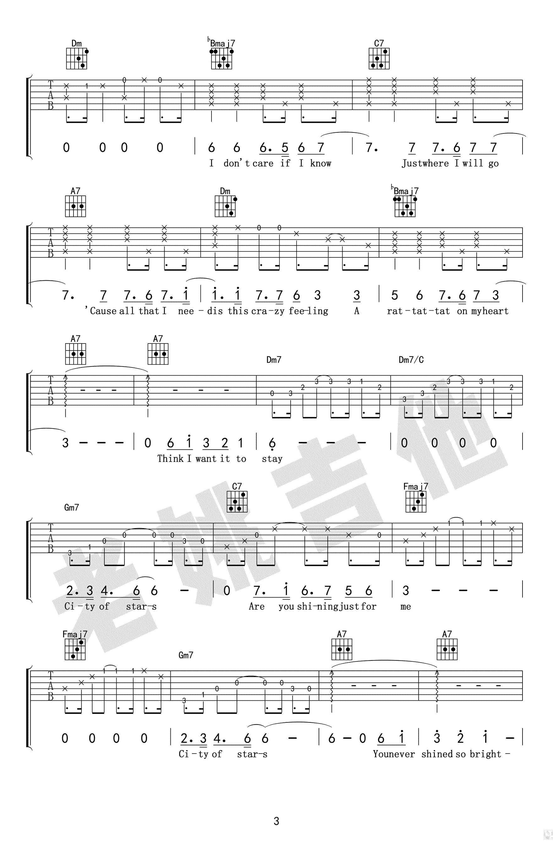 曲谱介绍: City of Stars吉他谱,电影爱乐之城(la la land)主题曲,《City of Stars》六线谱,高清弹唱图片谱。感谢老姚吉他编配出品,91吉他谱网站推荐上传。这首歌曲比较难,琴友们参照老师的讲解教学视频练习。