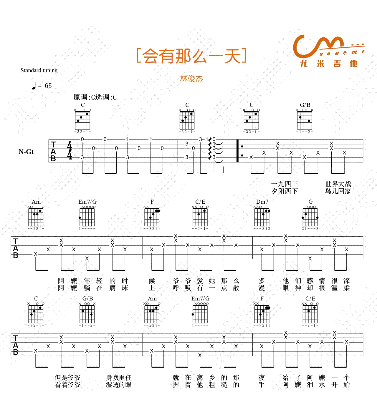 曲谱介绍: 会有那么一天吉他谱,林俊杰演唱,C调指法编配,会有那么一天吉他六线谱,高清图片谱。感谢尤米吉他出品,91吉他谱网站整理上传。林俊杰根据爷爷奶奶的经历创作,唱出相爱的人因战争而分离的感人爱情故事。表达了对战争的排斥,热爱和平的心理。 下面是由尤米吉他许老师和柚子同学,给大家带来的《会有那么一天》吉他弹唱示范演示视频: