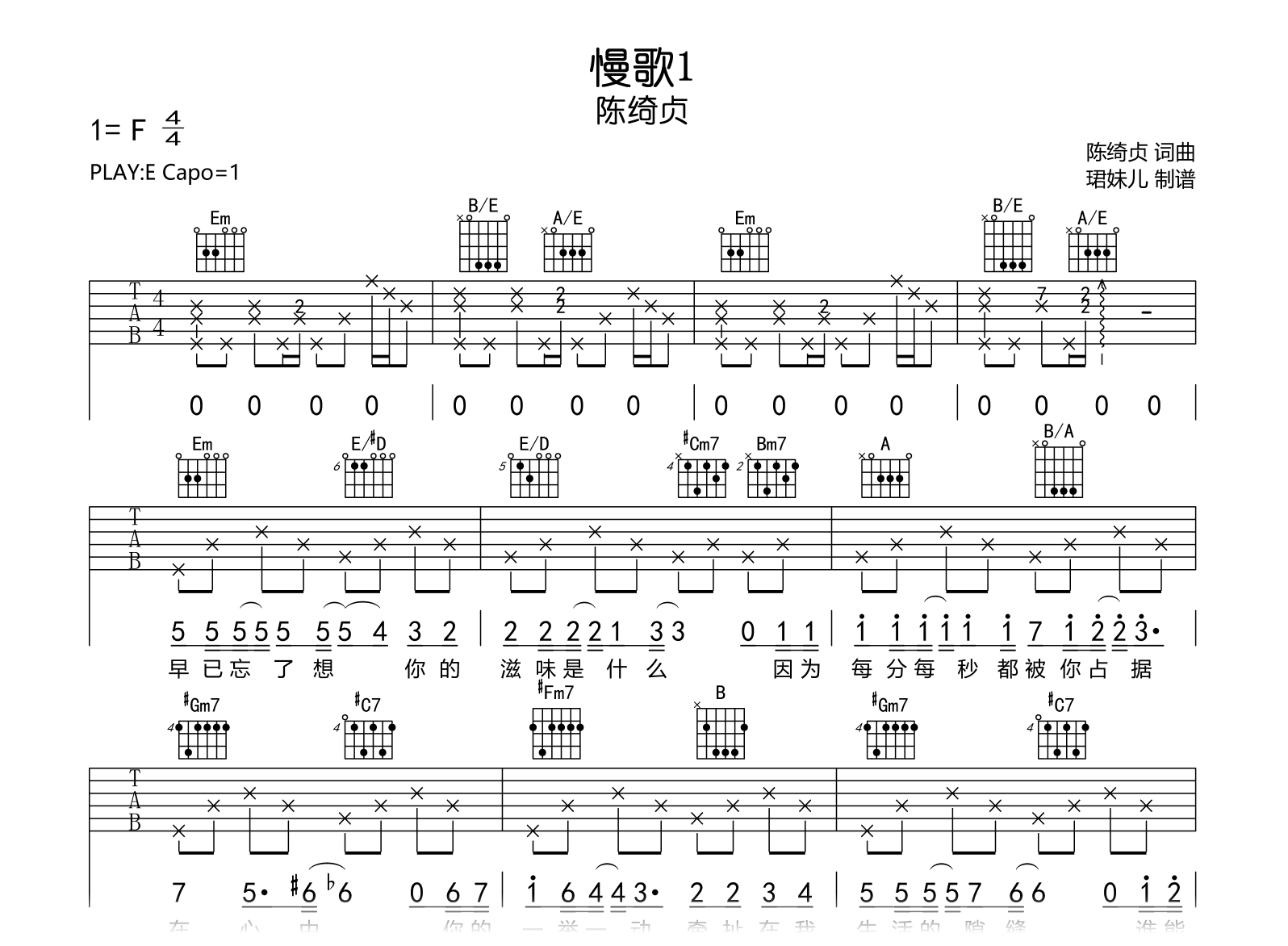 曲谱介绍: 慢歌1吉他谱,陈绮贞演唱,《慢歌1》吉他弹唱谱,原调F,采用E调指法编配,建议变调夹1品,速度85BPM,演奏难度较简单易上手,完整版共三张高清图片谱。 《慢歌1》是《还是会寂寞》的另一个版本,两版各有各的好。慢歌像分开以后再度回首这段感情,吟唱着不舍的悲情。