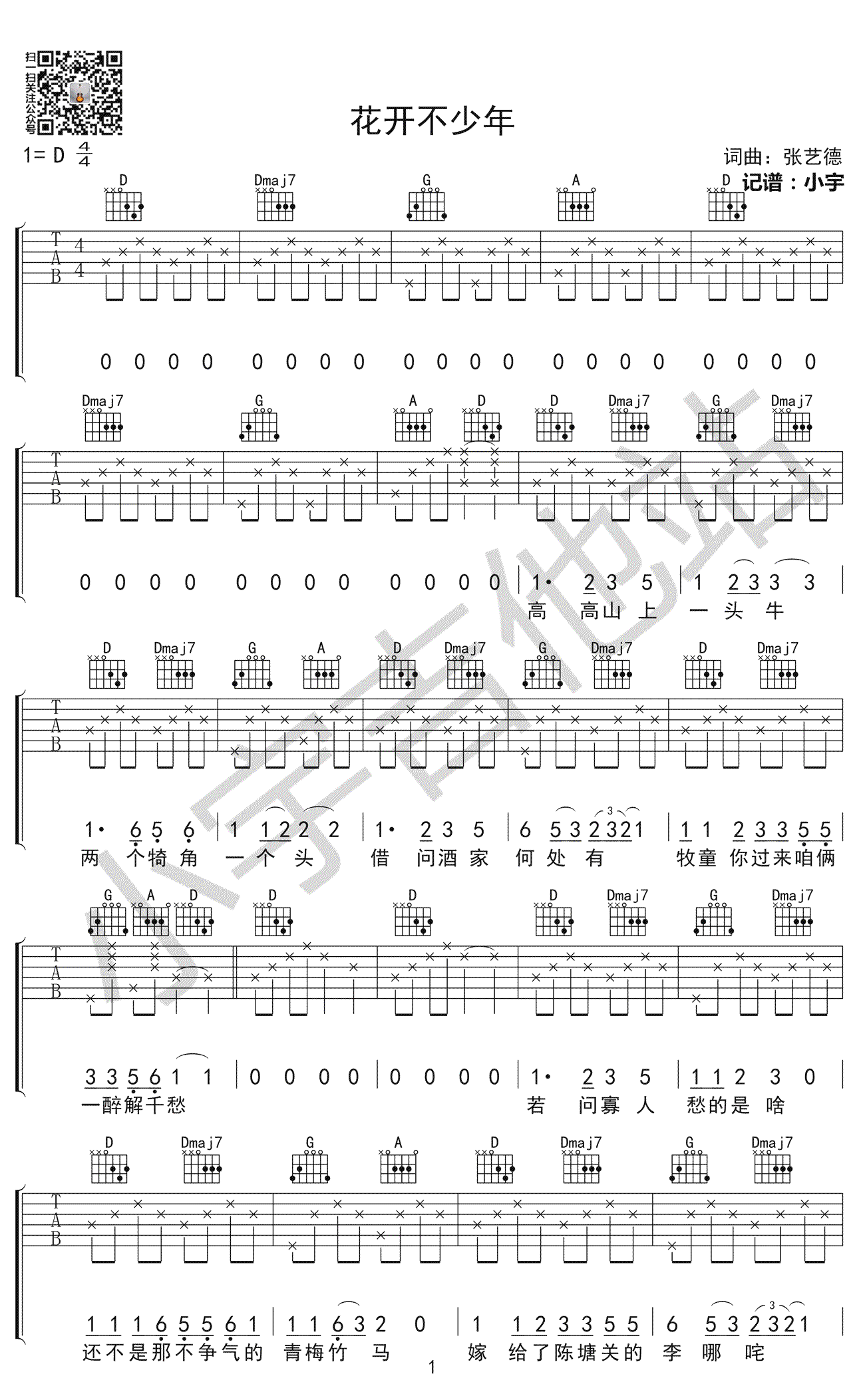 曲谱介绍: 花开不少年吉他谱,张艺德演唱的民谣歌曲,D调指法,高清弹唱谱,花开不少年六线谱,四张图片谱。感谢小宇记谱编配,91吉他谱网站上传。 豆瓣音乐人张艺德《令人愉悦的忧伤》专辑歌曲,花有重开日,人无再少年,有趣的魔性歌谣,听的人无力抵抗。