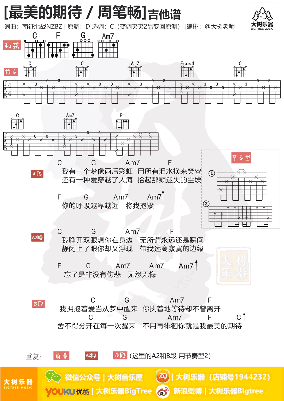 曲谱介绍: 最美的期待吉他谱,周笔畅演唱,原调D,选调C,变调夹夹第二品变回原调,最美的期待吉他弹唱谱,高清图片谱,感谢大树老师编排,91吉他谱上传分享。周笔畅一首好听的励志情歌,也成为网络热门歌曲,真爱来临之前,我们每个人都会历经漫长的等待和时间的考验,别放弃,雨后的彩虹会更加美好绚丽!喜欢这首歌曲的琴友们就跟随老师的吉他弹唱和教学练习起来吧! 《最美的期待》吉他弹唱演示: