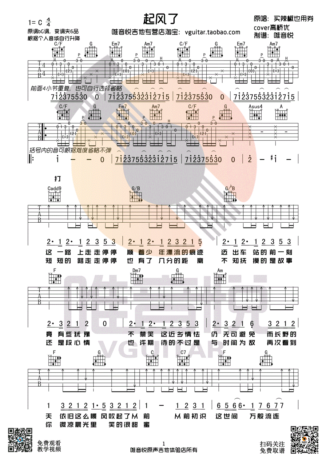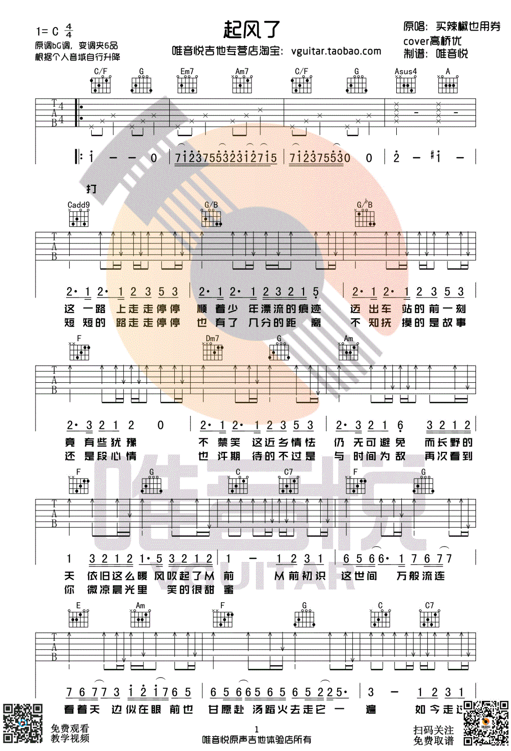 曲谱介绍: 起风了吉他谱,买辣椒也用券演唱,C调原版+简单版两个版本,推荐变调夹夹六品,根据个人音域自行升降,唯音悦编配,起风了吉他弹唱谱,三张图片谱,前奏的速度比较快,所以练习起来注意一定要从慢练起! 单曲循环的一首抖音热门歌曲,原曲来自于高桥优演唱的日剧“深夜食堂”片尾曲,动听的歌声直击心里,感动着每一个人。 起风了吉他谱原版: