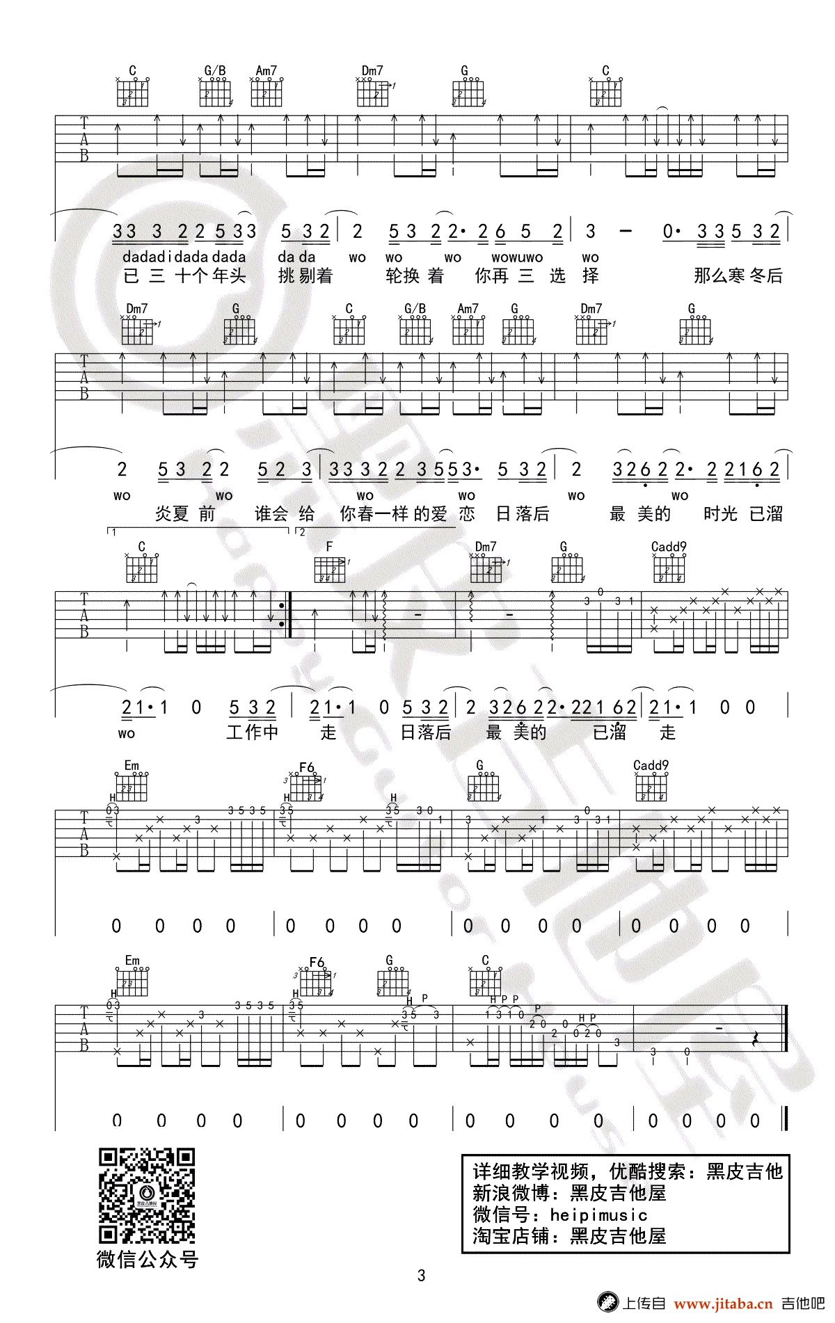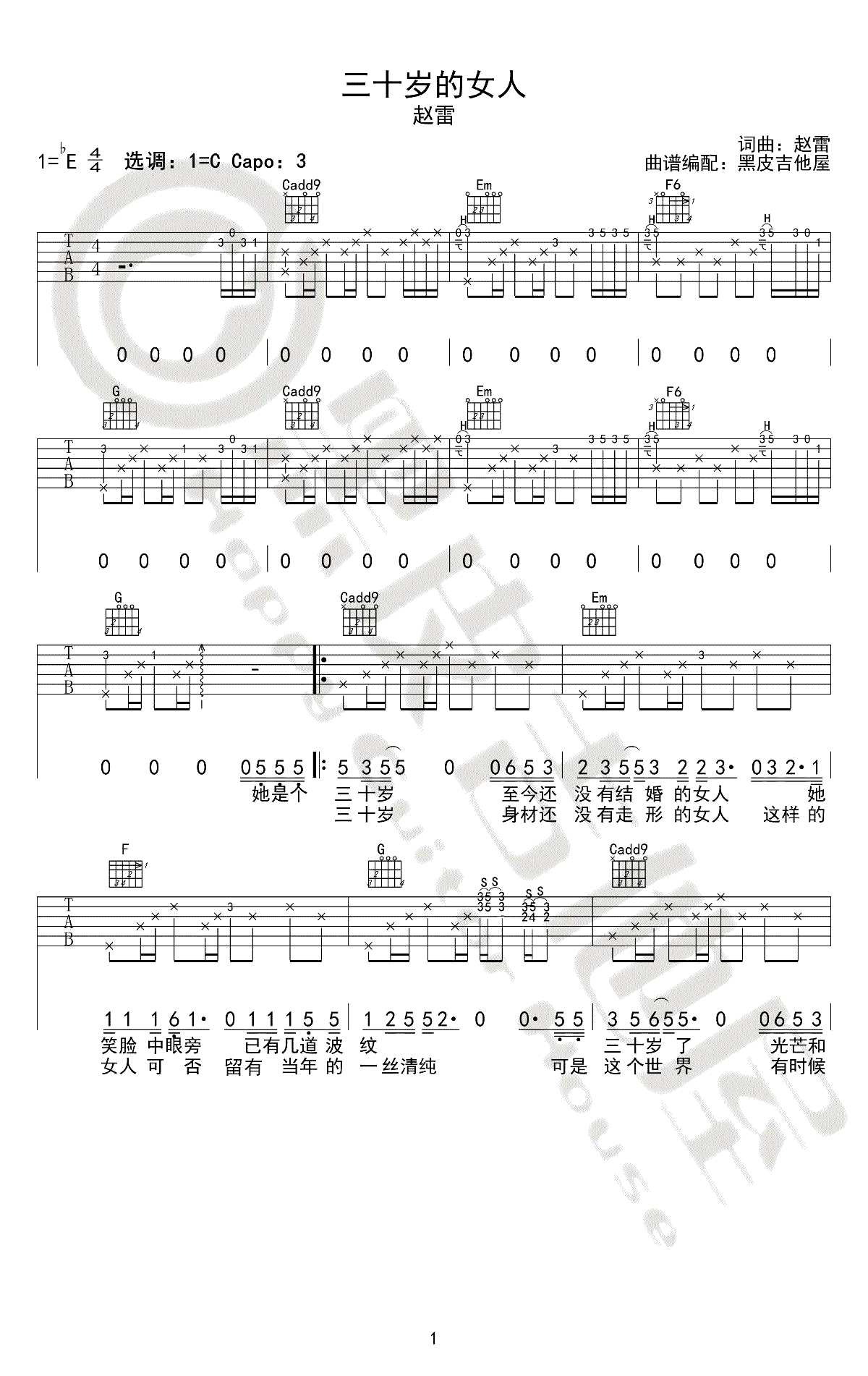 曲谱介绍: 三十岁的女人吉他谱,赵雷演唱,原调降E,本曲谱选用C调指法编配,capo夹三品,三十岁的女人六线谱,三张图片谱例,感谢黑皮吉他屋出品。随谱附上吉他弹唱和教学视频。歌曲弹奏难度适中,整体弹奏比较简单,琴友们只需要多注意前奏尾奏部分练习。三十岁的女人,像是静美的时光里绚丽斑斓的秋叶,让人心襟摇曳,陶醉其中,那是一种成熟的心动。