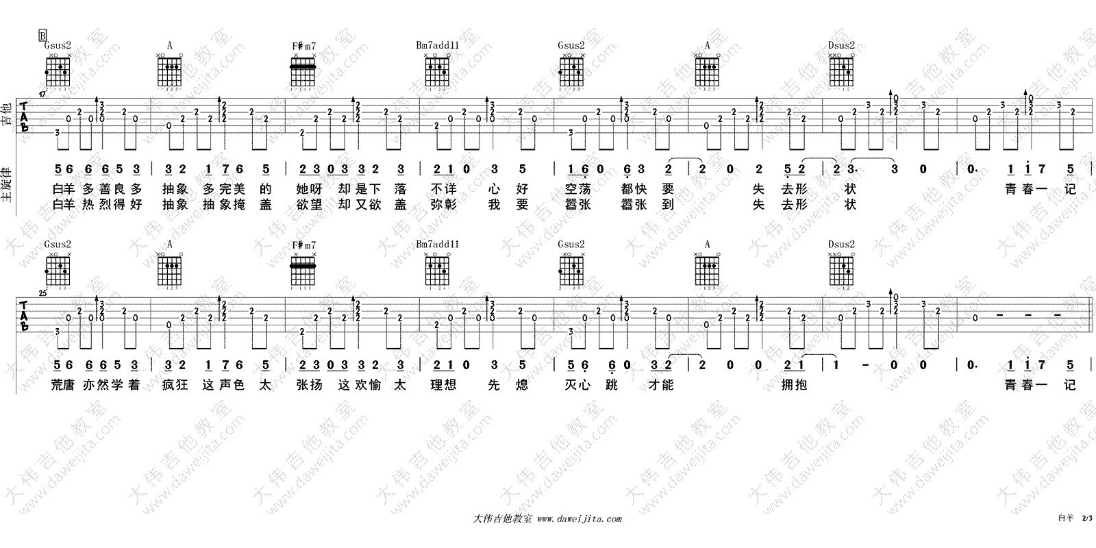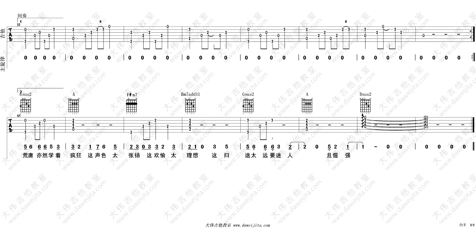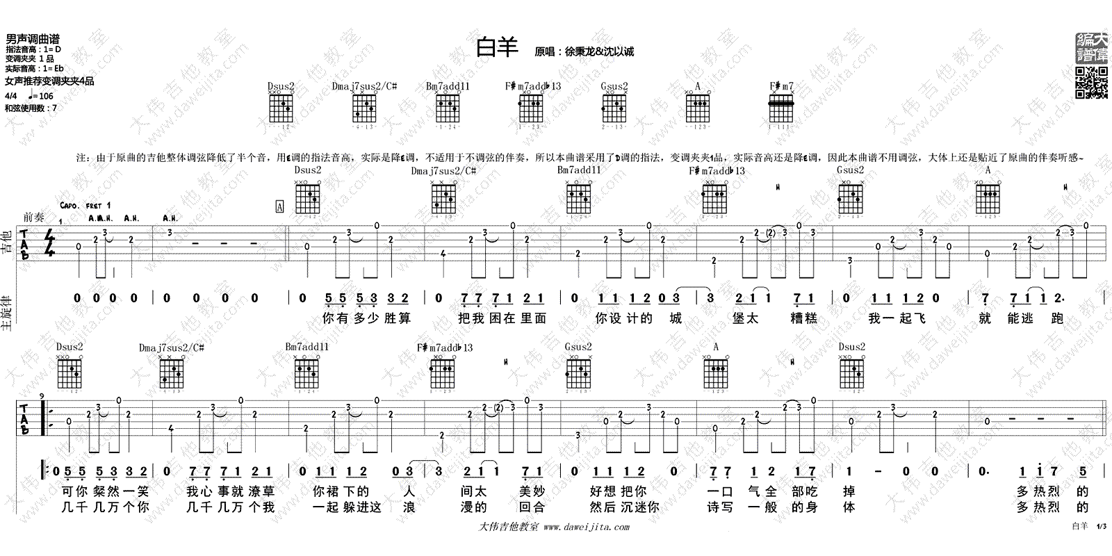 曲谱介绍: 白羊吉他谱,徐秉龙演唱,男生调曲谱,原调Eb,变调夹夹一品,选用D调指法编配。女声推荐变调夹夹四品。白羊六线谱,三张图片谱高清版,琴友们可以点击放大图片浏览。感谢大伟吉他教室出品,随谱附上配套吉他弹唱视频,大家参照示范演示学习。如小太阳温暖的白羊是热烈纯真的星座,温柔的歌声唱出了心里爱恋的那个白羊座的TA。
