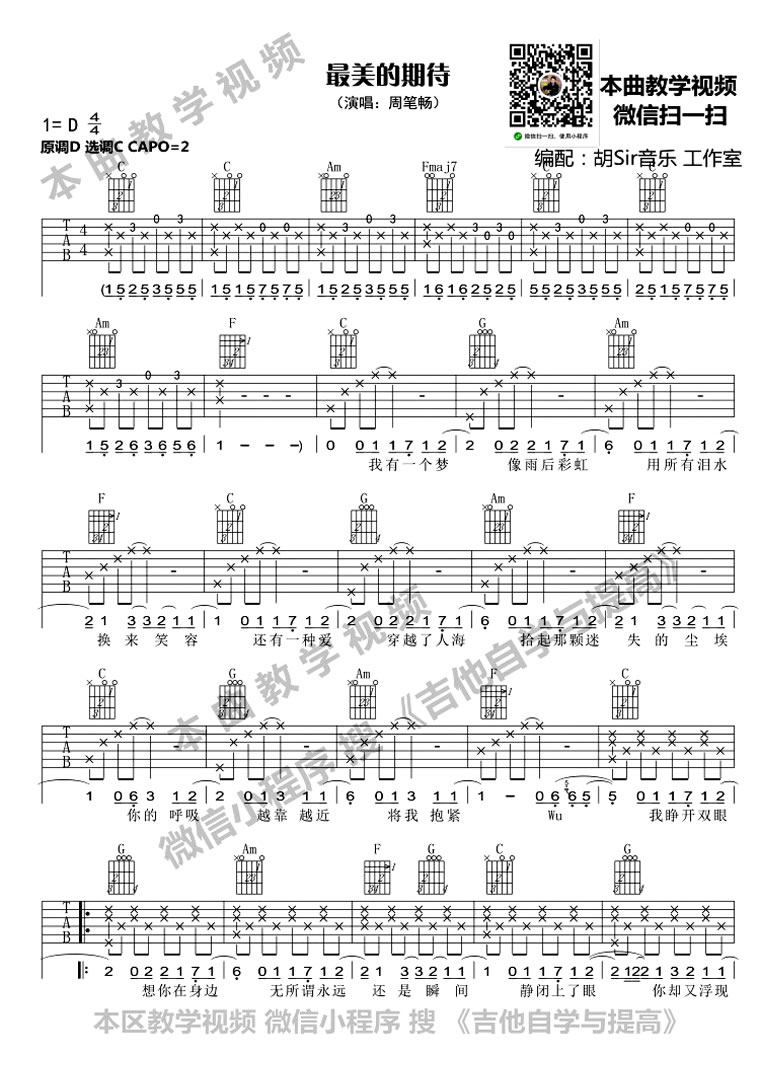 曲谱介绍: 最美的期待吉他谱,周笔畅演唱,最美的期待六线谱,原调D,选调C,变调夹夹第二品。南征北战作词作曲,是电视剧《茧镇奇缘》的片头曲。感谢胡Sir音乐工作室编配,91吉他谱网站上传。 笔笔独特的嗓音搭配充满温暖的旋律和歌词,结束后仍然余音绕梁,忍不住单曲循环,尤其高潮部分“我拥抱着爱当从梦中醒来 你执着地等待却不曾离开”,成为2018开春最暖励志情歌。