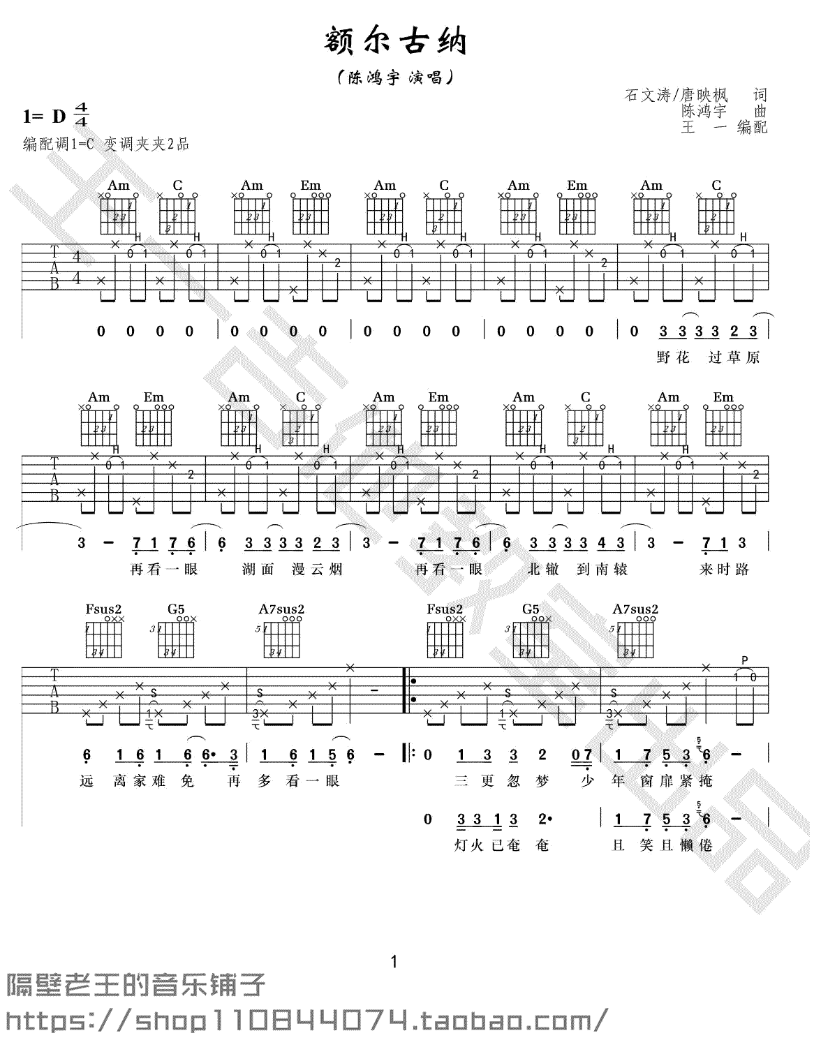 曲谱介绍: 额尔古纳吉他谱,陈鸿宇演唱的民谣创作歌曲,C调指法,变调夹夹第二品。额尔古纳六线谱,三张图片谱,王一编配,91吉他谱网站整理上传。随谱附上《额尔古纳》吉他教学视频,琴友们跟随老师的示范讲解练习。陈鸿宇将思乡之情款款托付于音乐中,王一老师通过吉他琴音,带你领略一样的乡愁不一样的表达。