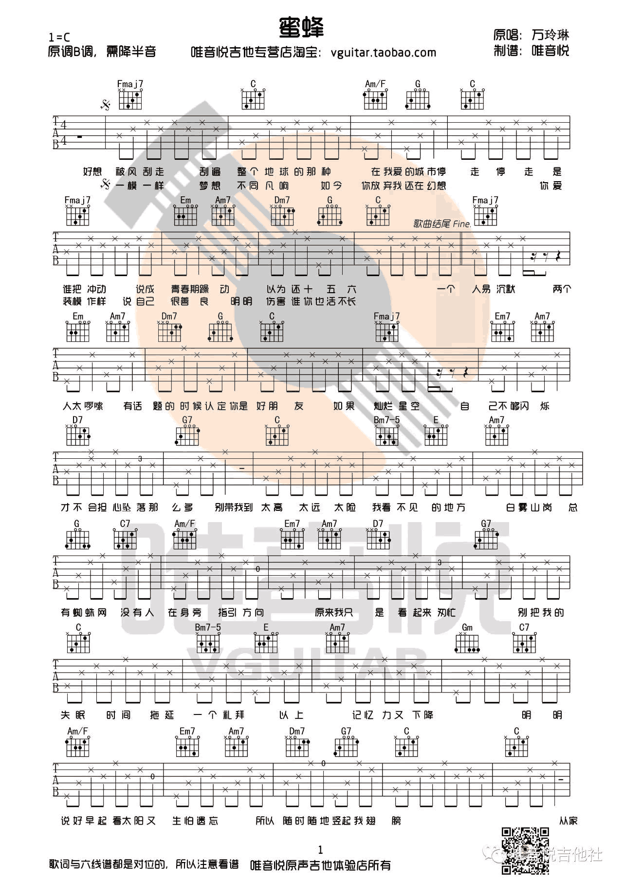 曲谱介绍: 万玲琳《蜜蜂》吉他谱,简单版选用C调指法编配,需降半音调弦。超女万岁爷原创作品,蜜蜂六线谱,吉他弹唱图片谱。感谢唯音悦出品,91吉他谱网站上传。 这首歌里面没有什么太多的技巧, 主要是在加花部分,如果大家加花部分弹唱顾不过来的话, 可以用简单的节奏型就OK啦~随谱附上《蜜蜂》吉他弹唱教学视频: