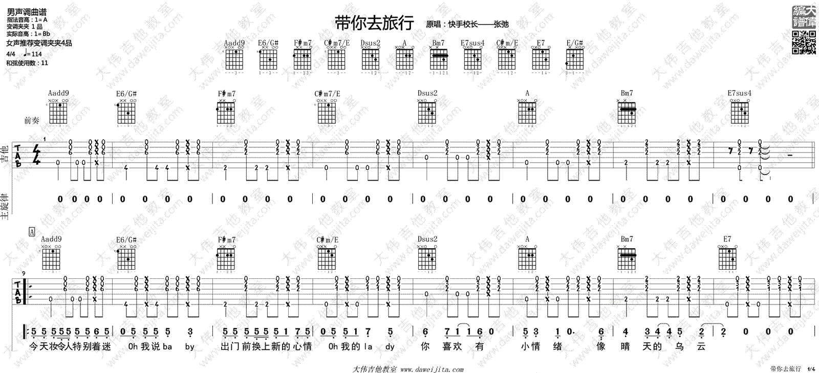 曲谱介绍: 带你去旅行吉他谱,校长演唱的一首轻快活泼的热门网络歌曲,男生调曲谱,指法音高A,变调夹夹一品,实际音高Bb,女生推荐变调夹夹四品。带你去旅行六线谱,高清弹唱图片谱共四张谱例,点击图片可放大浏览。感谢大伟吉他教室编配出品,附上配套吉他弹唱演示教学视频,方便琴友们参照练习。