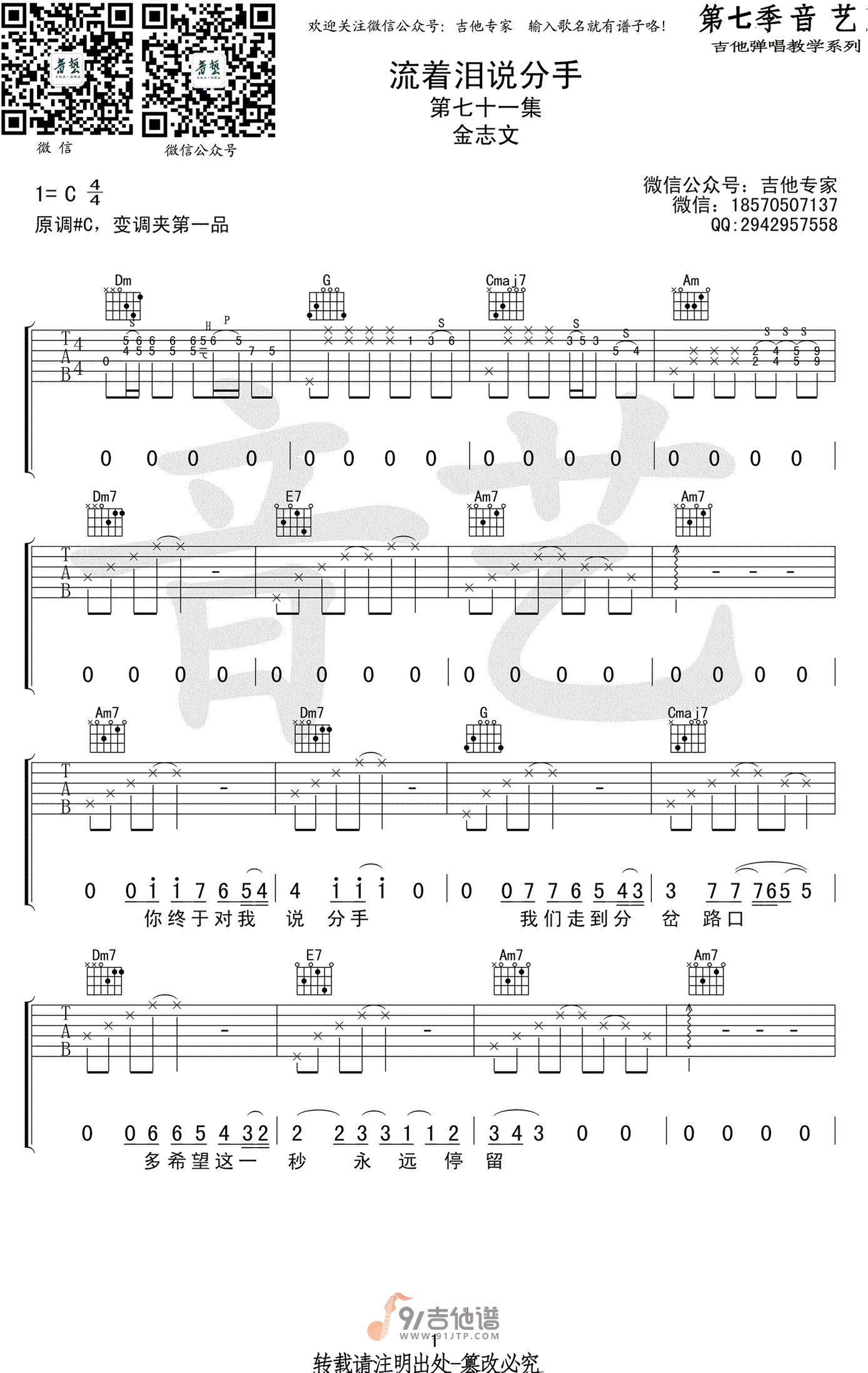 曲谱介绍: 曲谱简介:流着泪说分手吉他谱,金志文演唱的一首歌曲,4/4拍的节奏,这首歌曲的原调为#C调,这里曲谱采用了C调指法进行编配,演唱时夹变调夹1品可回到原调,也可根据个人实际嗓音情况选择。曲谱由吉他专家编配出品。金志文一开口,悲情扑面而来,以一种安静的忧伤阐述一段爱而不得的感情,唱出了对情感的遗憾和不甘。这首歌曲当然不是要人伤心落泪,而是让听众记住爱的刻骨铭心,珍惜爱的彼此。