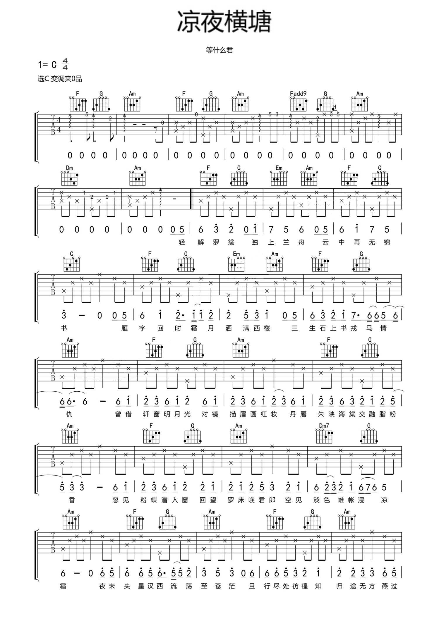 曲谱介绍: 等什么君《凉夜横塘》吉他谱_C调吉他弹唱谱