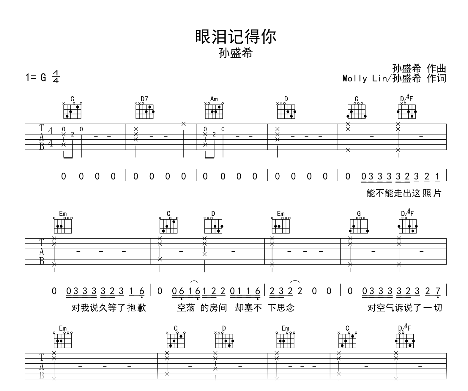 眼泪记得你吉他谱 - 孙盛希 - G调吉他弹唱谱