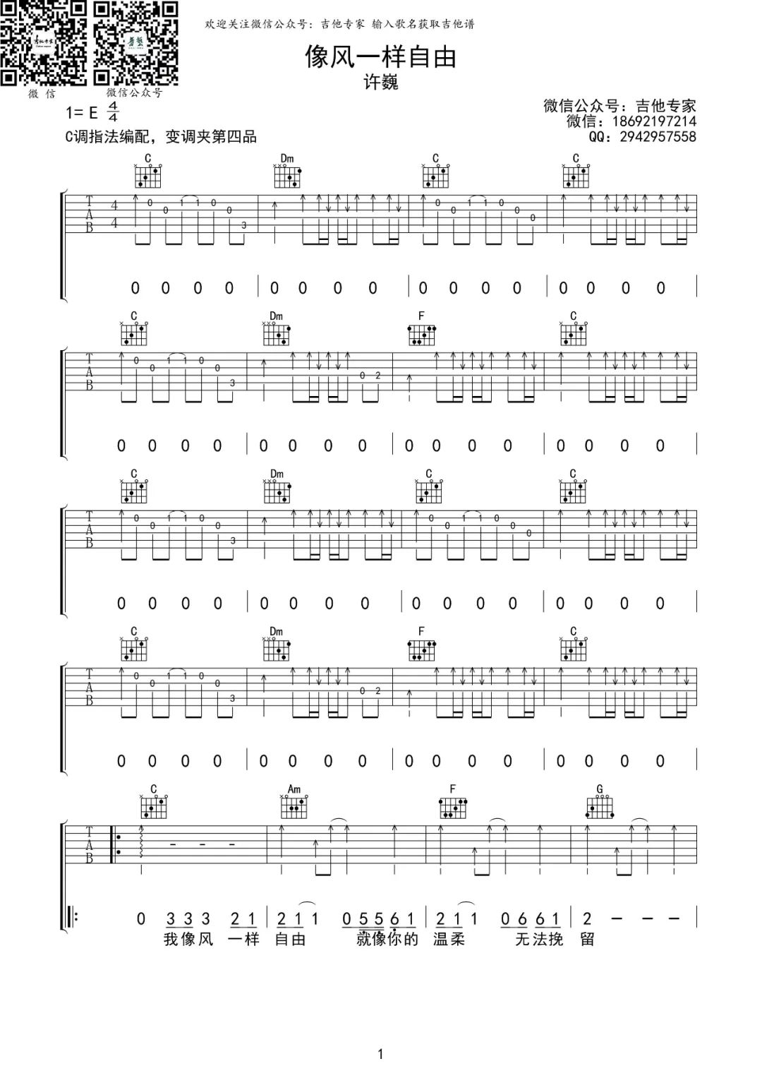 曲谱介绍: 吉他谱介绍:像风一样自由吉他谱,许巍演唱的一首歌曲,4/4拍的节奏,这首歌曲的原调为E调,这里曲谱采用了C调指法进行编配,演唱时夹变调夹4品可回到原调,也可根据个人实际嗓音情况选择。曲谱由琴谱网更新上传,共3张高清图片弹唱吉他谱例,来源于@吉他专家编配出品。这首歌旋律和歌词就像歌名一样,自由洒脱。我们活着,心灵应当自由。不受贪嗔痴的纠缠禁锢,不受他人眼光的压力。修炼自己,锻炼自己,成为自己。