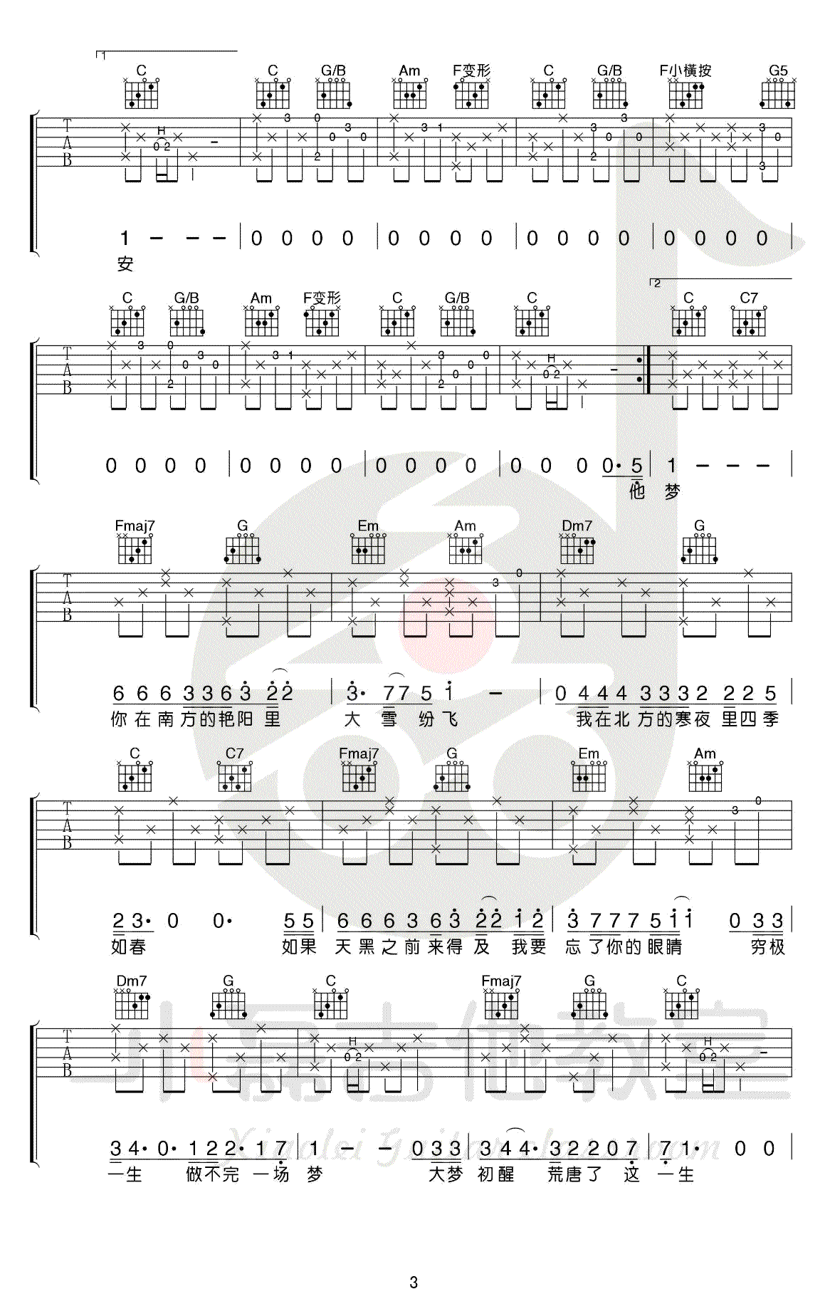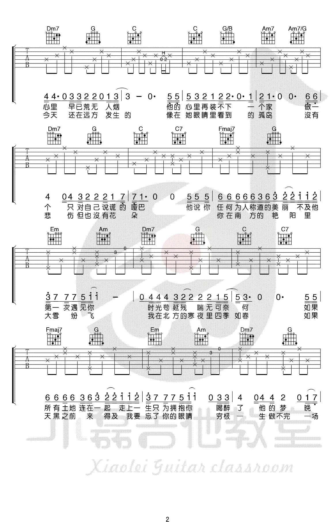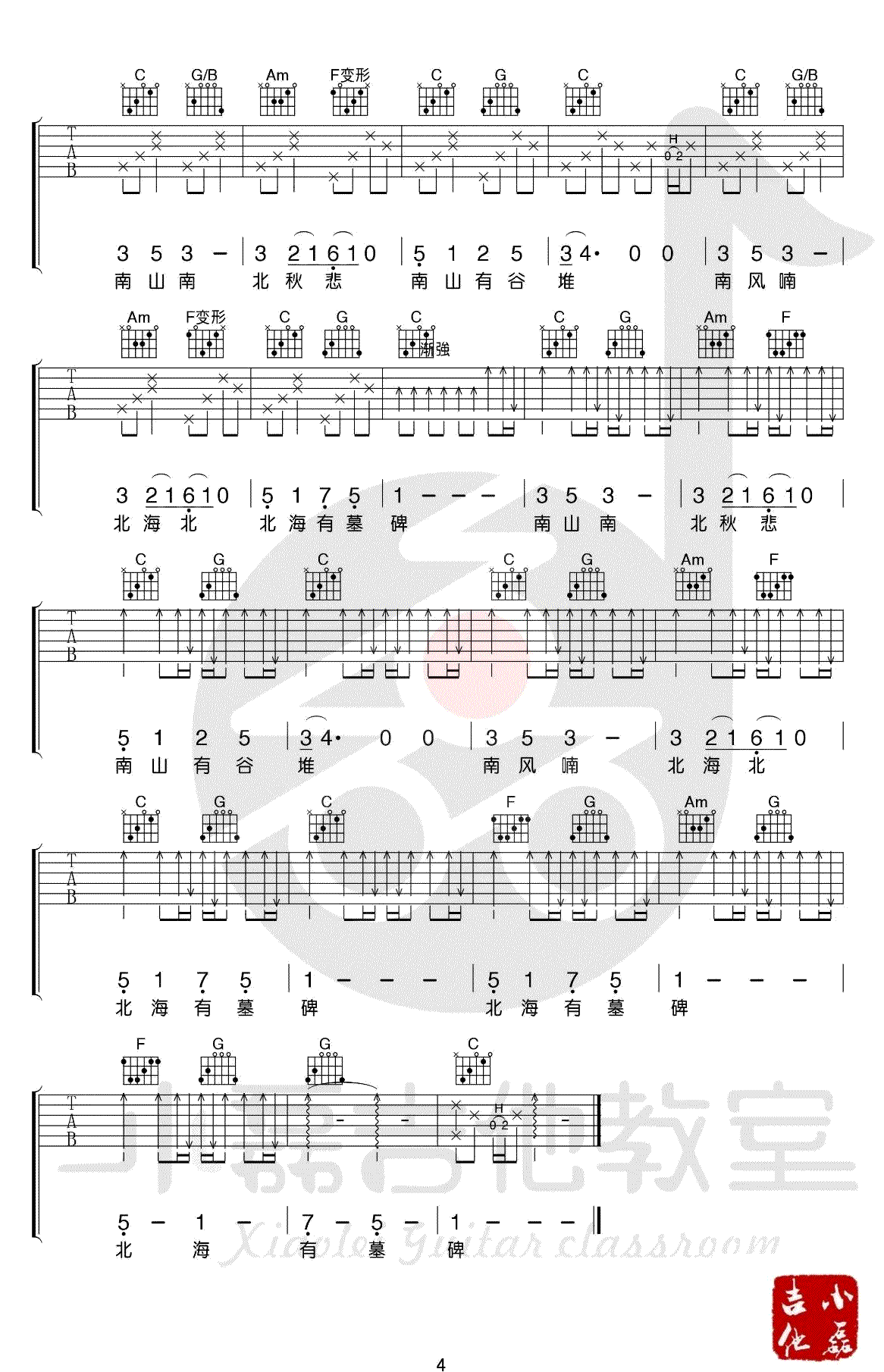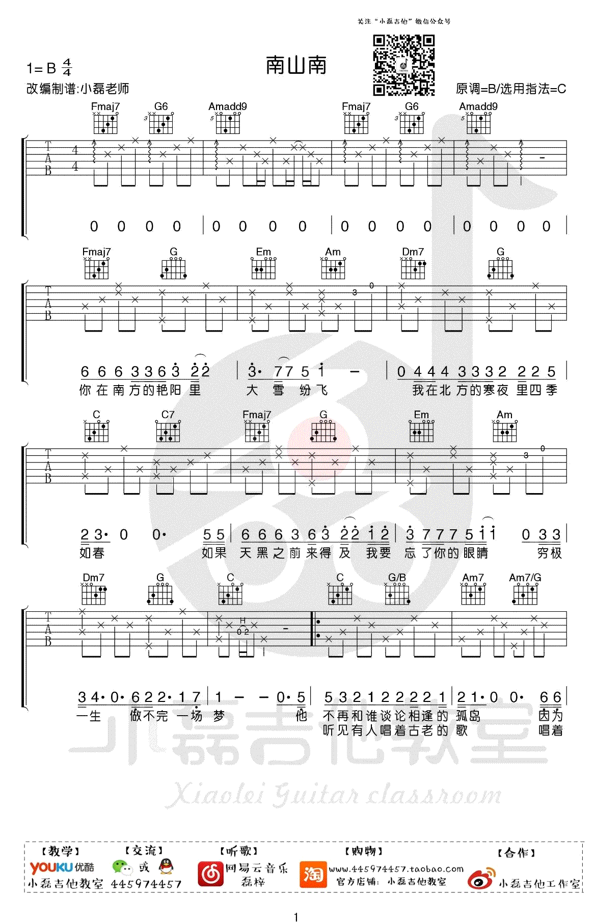 曲谱介绍: 马頔《南山南》吉他谱,原调B,选用C调指法,南山南吉他弹唱谱,四张图片谱。感谢小磊老师编配和提供弹唱教学。吉他乐曲简析: 作为马啪啪唯一一个代表作品,这首南山南给予民谣市场很大的意义!很多人翻唱过,例如张磊的版本! 我制作的这个乐谱是改编自之前在酒吧驻唱的时候自己演奏的版本,用的C调指法,加入了间奏,更加的有演奏色彩和层次! 学习的重点在于弹唱结合,还有间奏的指弹小段,后段的扫弦需要突出气氛,抓住重点努力练习!