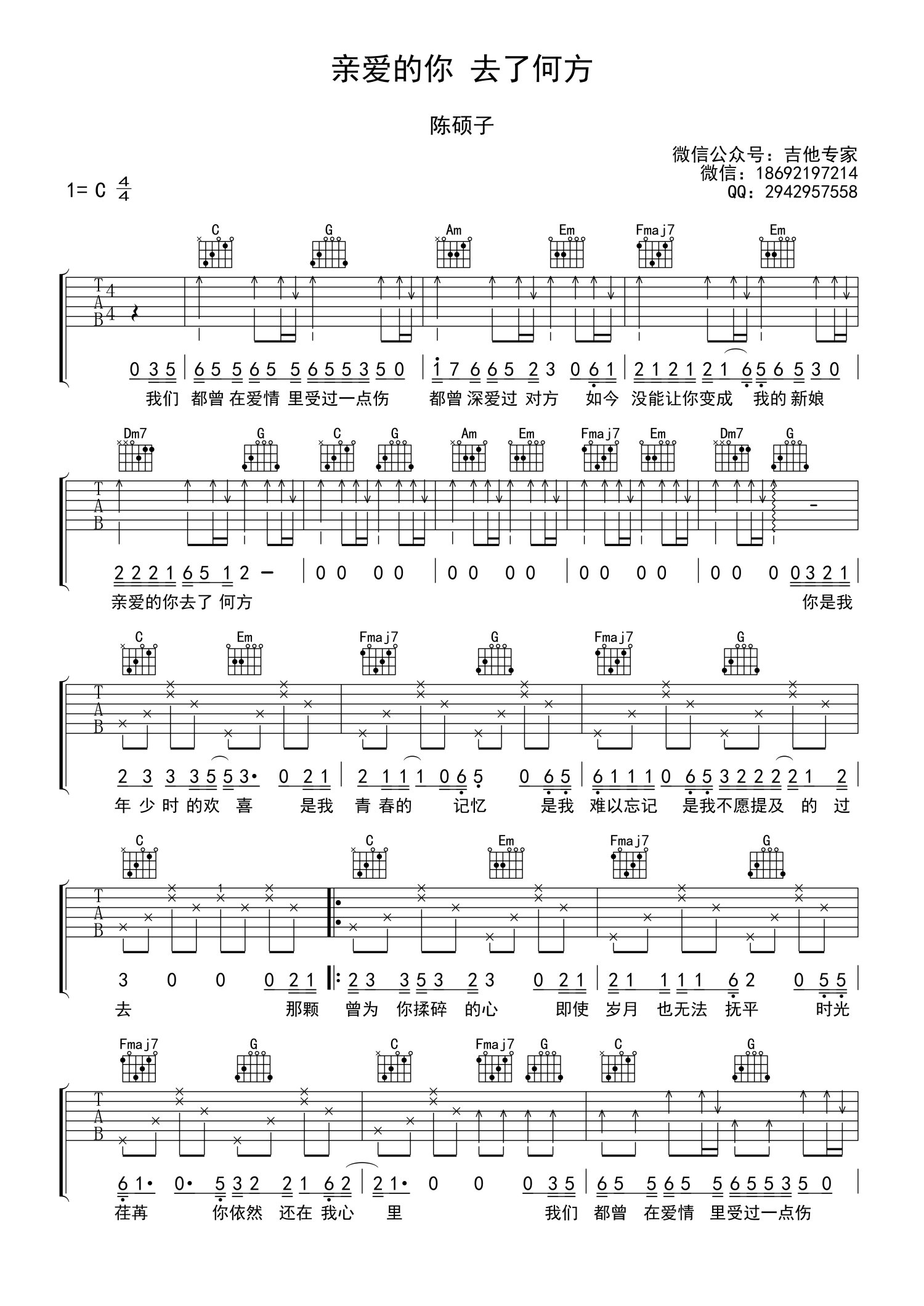 • 亲爱的你去了何方吉他谱 - 陈硕子 - C调吉他弹唱谱第1张