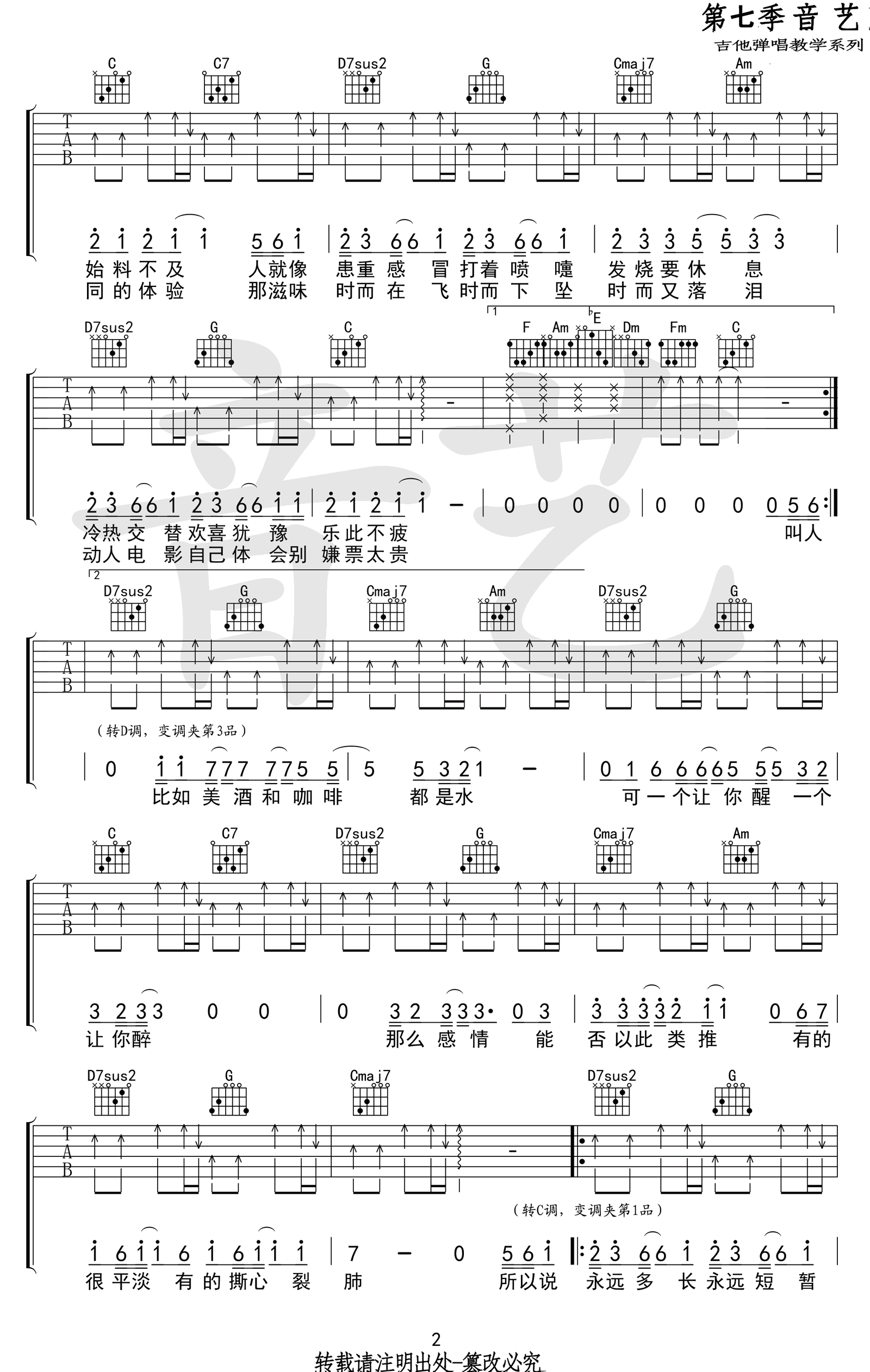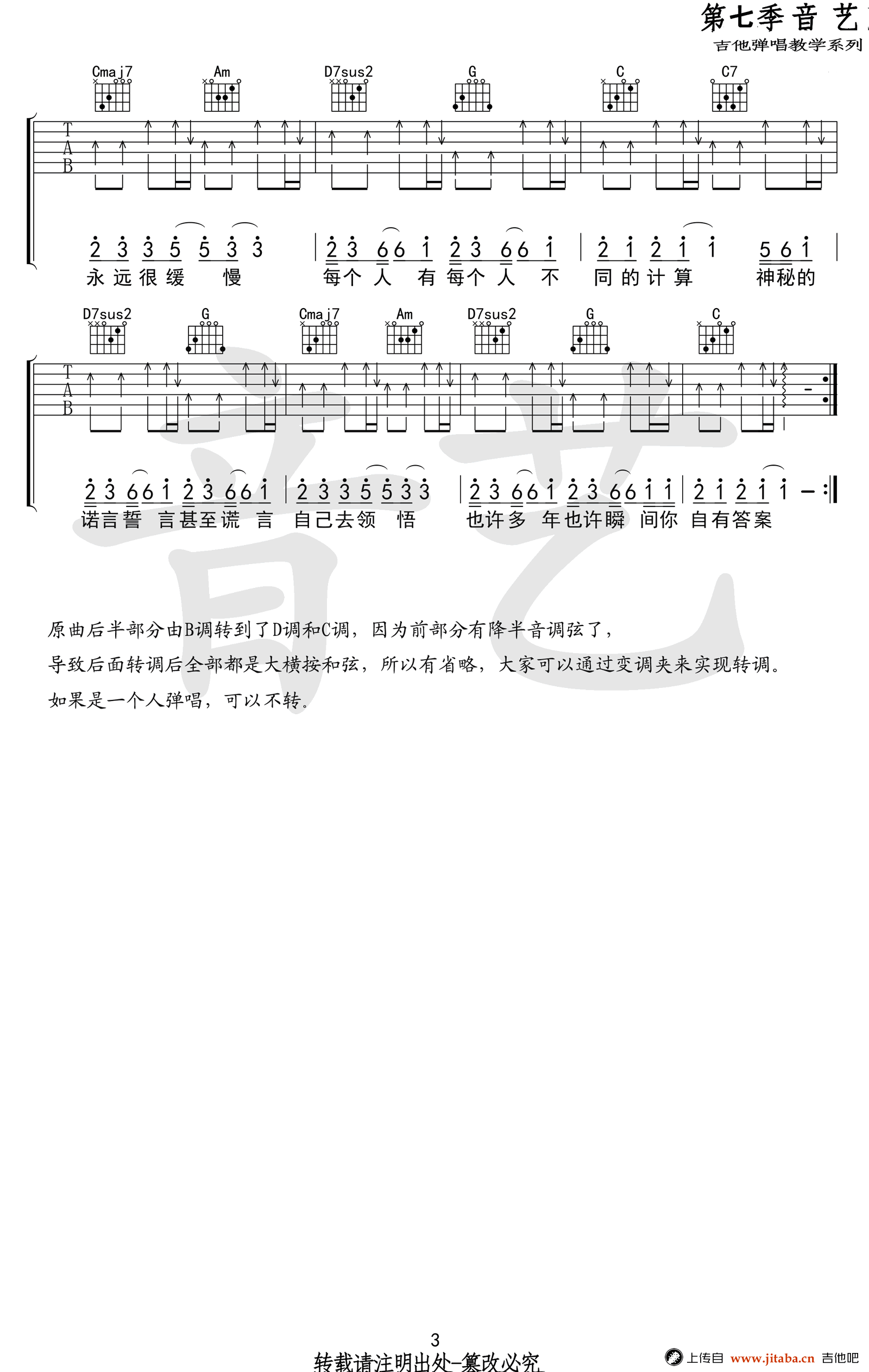 曲谱介绍: 杨坤郭采洁《答案》吉他谱,原调B,降半音调弦,B转D转C。一首男女对唱情歌,热门抖音神曲,答案六线谱,高清弹唱图片谱,音艺出品,91吉他谱网站上传。 摇滚猫老师编配说明:歌曲原调B转D转C,但是为了前面部分好弹,降半音调弦,用的C调的指法,所以就变成了C转降E转降D,转调后全部是大横按,很不好按,如果用G调编配的话,也是G转降B转降A,后面依旧是大横按,怎么也躲不过。一个人弹唱的话可以不需要转调,如果需要的话,也可以通过移动变调夹来处理,因为在转调的时候谱子特意留了空拍!