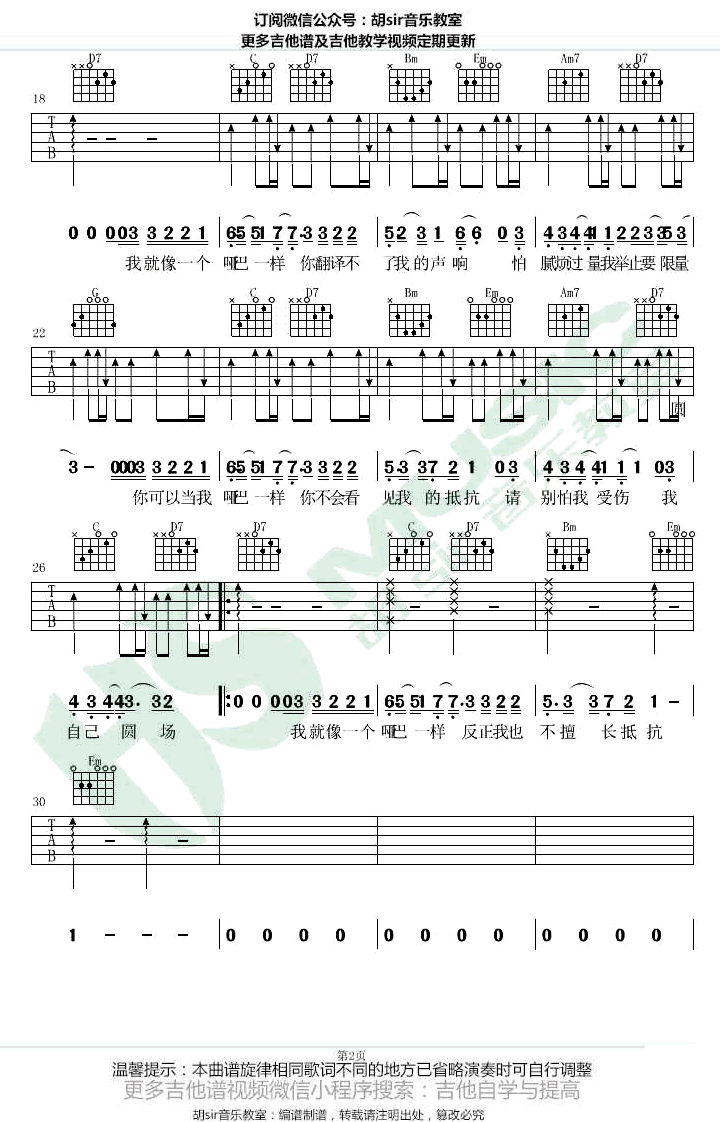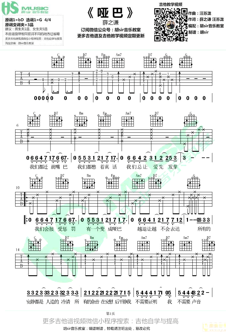 曲谱介绍: 哑巴吉他谱,G调最易上手版,薛之谦细腻演唱,将爱情“哑巴”的概念重新诠释。哑巴吉他弹唱谱,胡sir音乐教室出品,91吉他谱网站上传。 如果我表达出的情感会成为你的烦扰,那么请让我乖乖做个哑巴。江苏卫视《无限歌谣季》节目中,薛之谦全新改编汪苏泷原创、刘维原唱的这首歌曲,将感情中悲痛纠缠倾吐而出,得到无数听众的扎心共鸣。