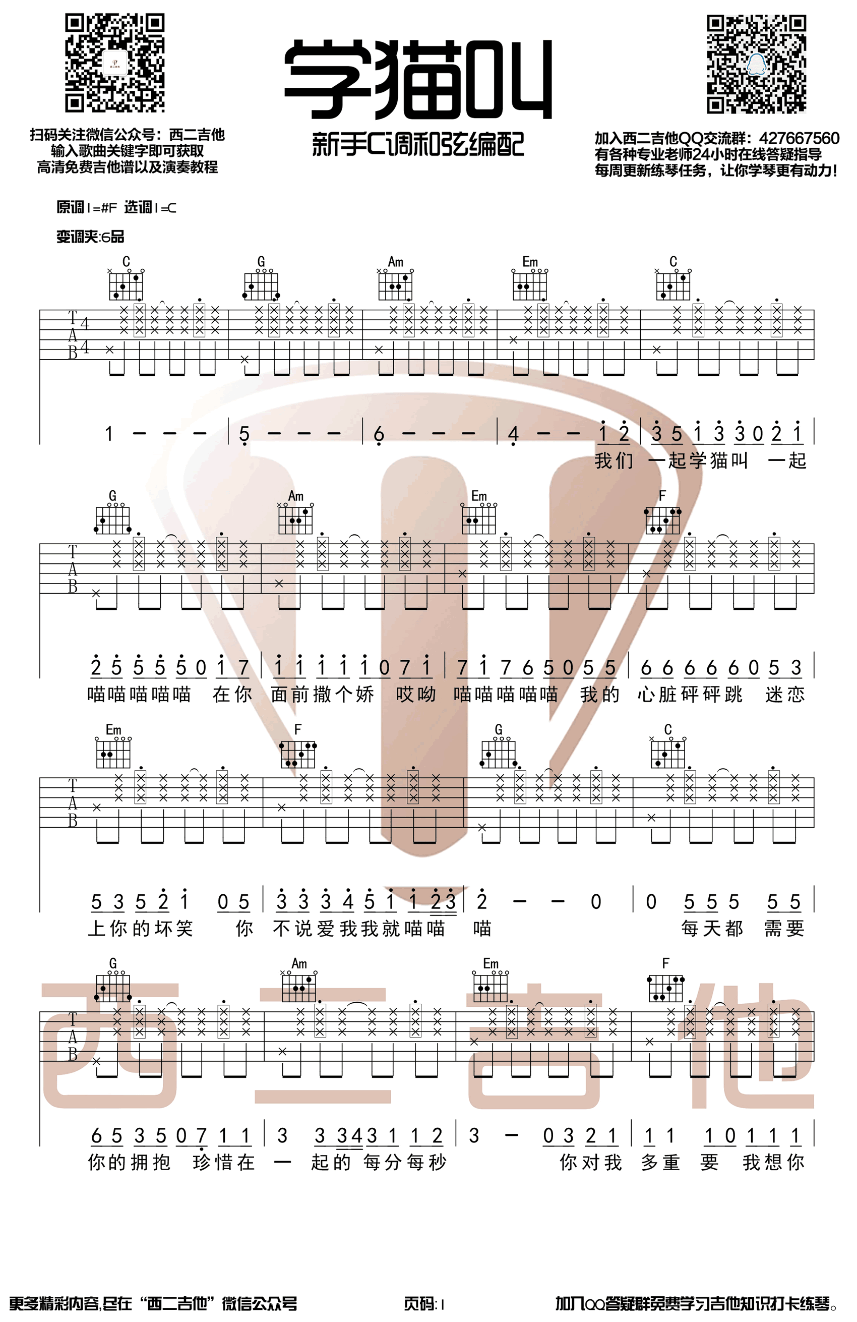 曲谱介绍: 学猫叫吉他谱,原调#F,选调C,变调夹夹第六品。一首热门抖音歌曲,学猫叫吉他弹唱谱,小潘潘/小峰峰演唱,六线谱完整版,共四张高清图片,西二吉他编配出品,91吉他谱网站上传分享。 甜腻的《学猫叫》是否让你感受到初恋的味道?温暖粉萌的歌声,将这份热恋的甜蜜情绪娓娓道来,唱出专属你的宠溺情歌。