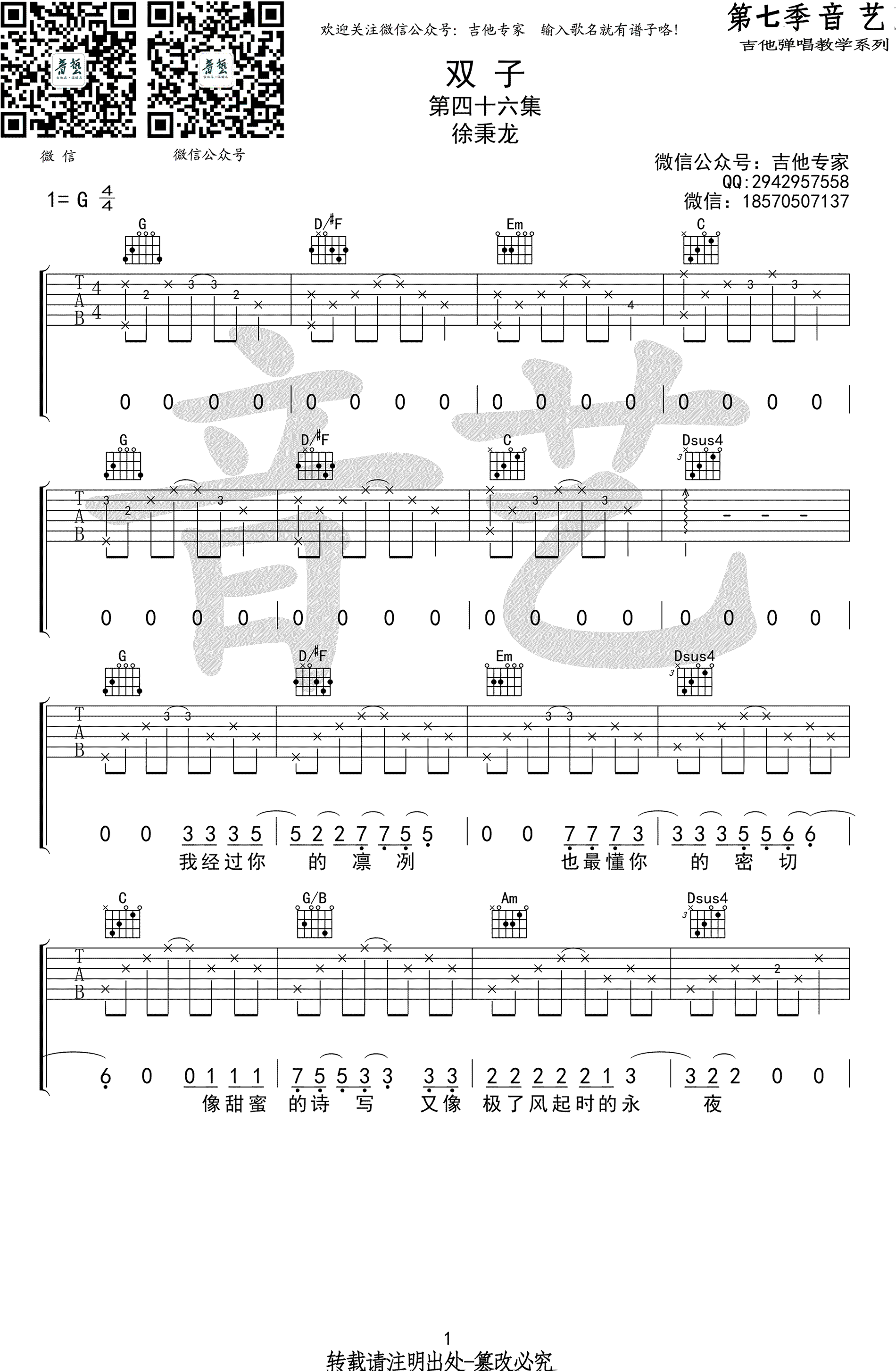 双子吉他谱 - 徐秉龙 - G调吉他弹唱谱