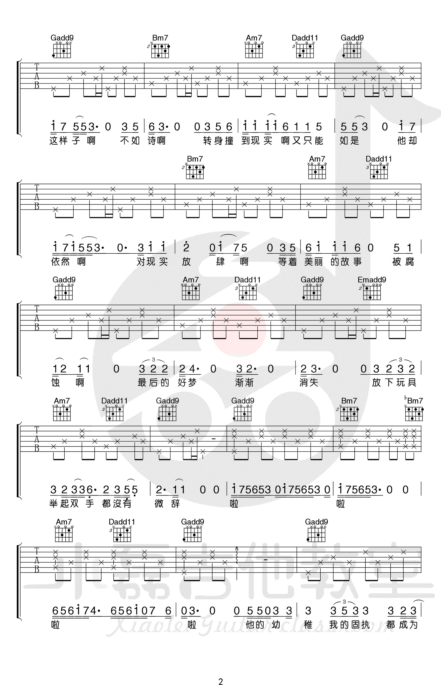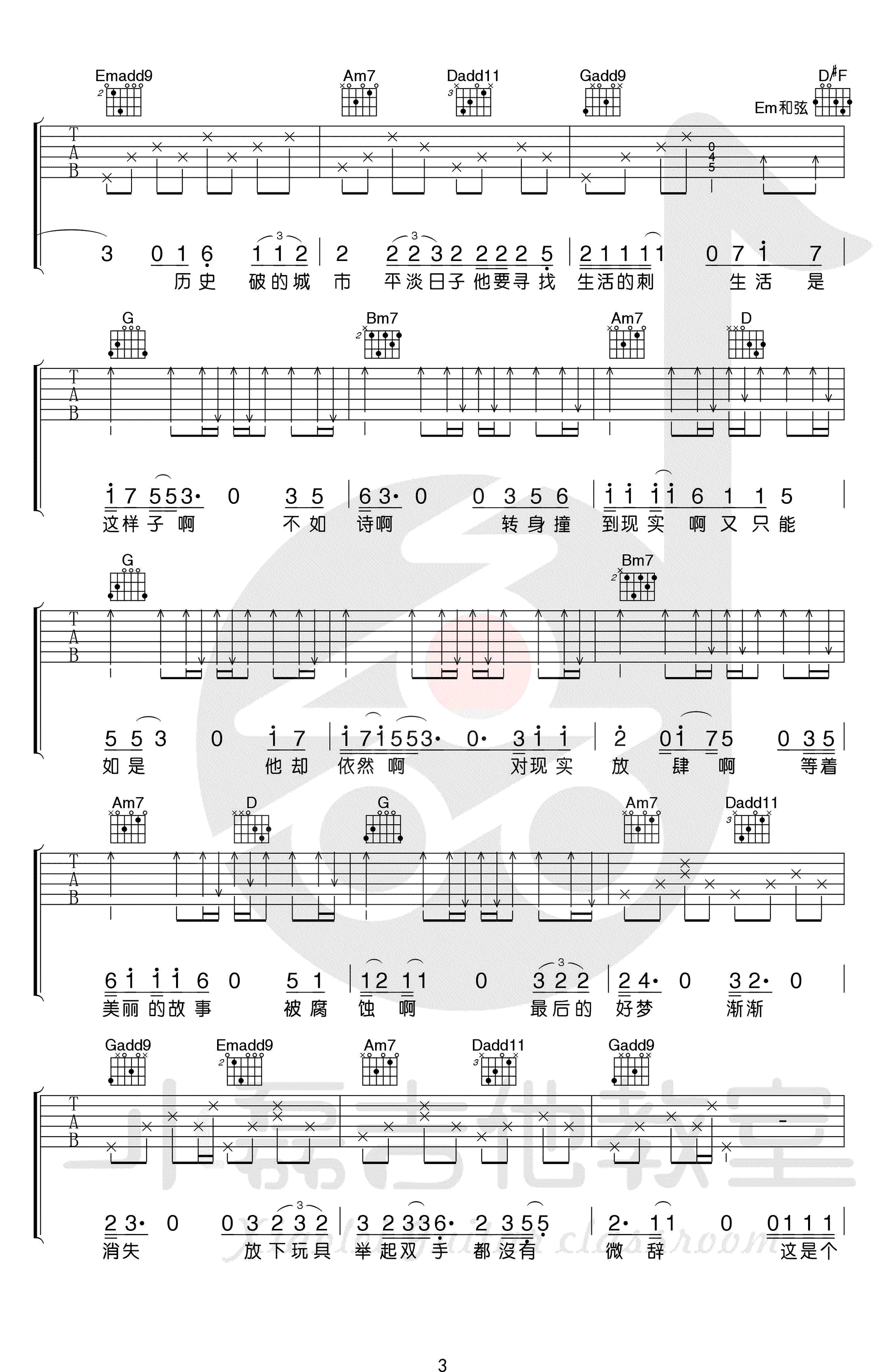 曲谱介绍: 宋冬野《平淡日子里的刺》吉他谱,原调降B,选用G调指法编配,CAPO三品,琴友们也可以根据自己的音域调整变调夹的位置。感谢小磊吉他出品,配套吉他弹唱教学视频视频附上,方便大家同步参照学习。 编配说明:这首歌的前奏,老师把原版中的钢琴旋律与和声走向加入到了吉他中!节奏和和弦转换会有些小难度,在弹唱部分编配比较简单!原版中很多和声转位组合比较好听,我们这里也尽可能保留下来了!后段的扫弦没什么难度,整曲还算结构分明,用来弹唱再好不过!难度:6级