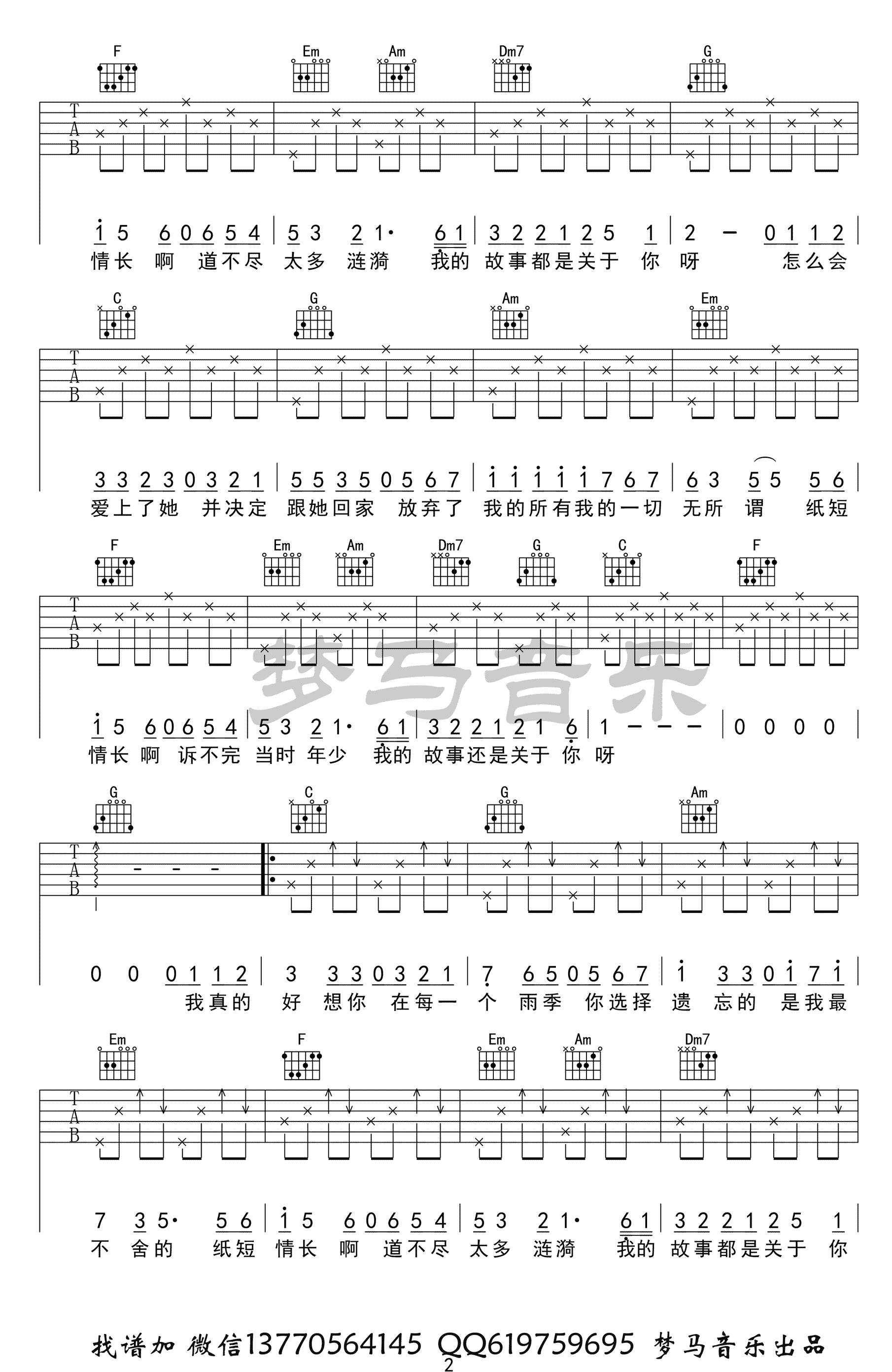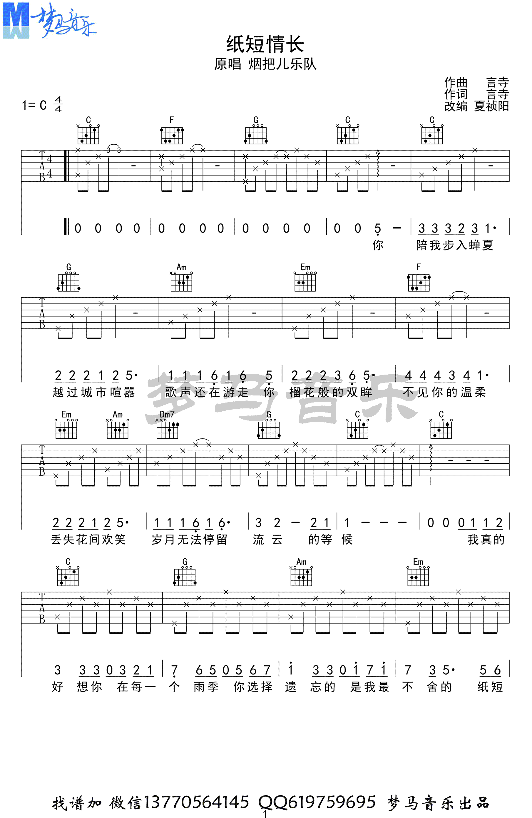 曲谱介绍: 烟把儿《纸短情长》吉他谱,C调指法编配,高清弹唱图片谱,纸短情长六线谱,梦马音乐出品。要点讲解:这首歌曲网上最近特别火,网上版本也很多。夏祯阳老师的这个改编版本,有自己的风格,整首歌很简单,适合初级者。大家可以尽情的弹唱。随谱附上吉他弹唱示范,琴友们参照视频练习。