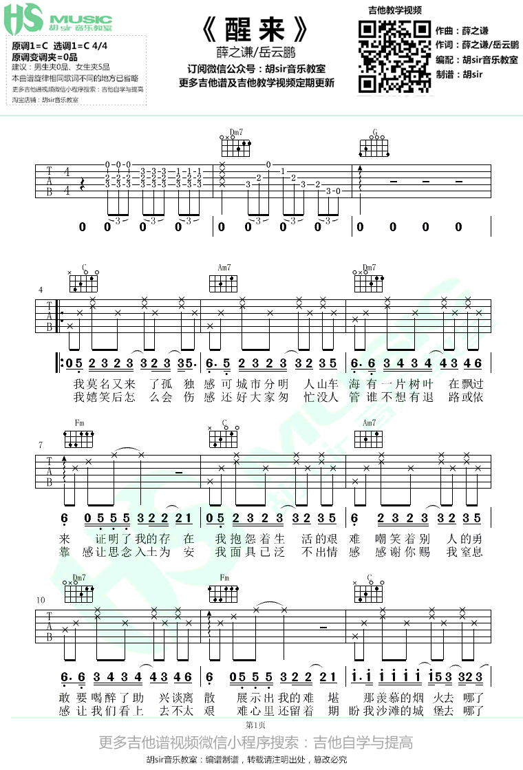 曲谱介绍: 醒来吉他谱,薛之谦岳云鹏演唱,C调指法,女生变调夹推荐第五品,醒来吉他弹唱谱,胡sir音乐教室编配出品,91吉他谱网站上传分享。 江苏卫视《无限歌谣季》节目,薛之谦、岳云鹏深情演唱的这首《醒来》,吉他弹唱张力十足的,歌词触动人心,唱出了追梦人的艰辛与坚持,引发强烈的共鸣。哪怕已向这个世界妥协,请依然保留心中的炽热。