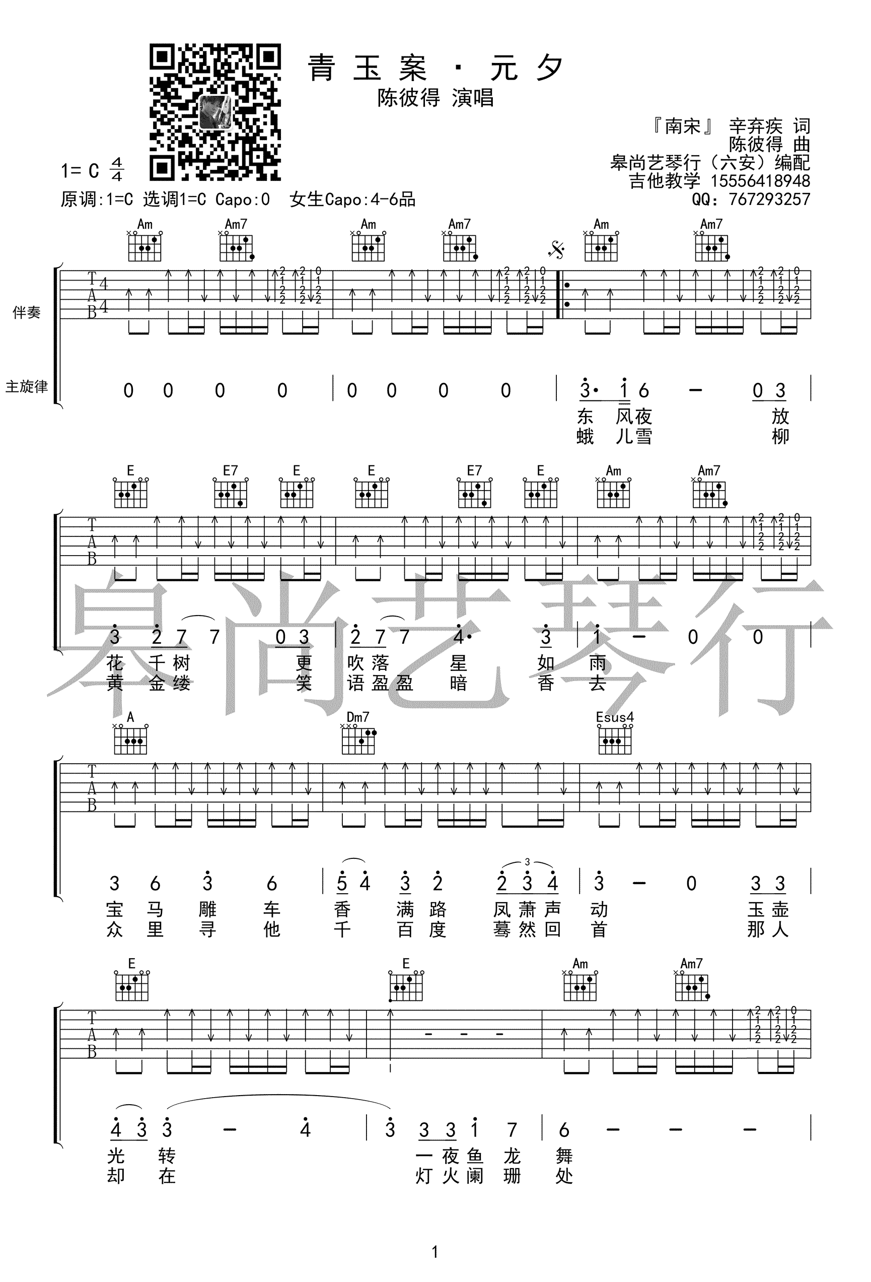 曲谱介绍: 陈彼得《青玉案元夕》吉他谱,C调指法编配,高清图片六线谱,一首用流行音乐诠释经典诗词的歌曲,青玉案元夕吉他弹唱谱,女生变调夹推荐4-6品,皋尚艺琴行出品,91吉他谱网站上传。 央视《经典咏流传》舞台,74岁的台湾音乐人陈彼得的这首歌曲燃烧了全场,掌声经久不息。当诗词被赋予再次的生命,一定是八百年前诗人最大的欣慰~