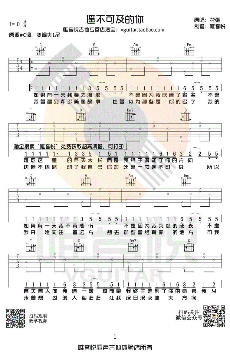 曲谱介绍: 花粥《遥不可及的你》吉他谱,原调#C,变调夹夹一品,选用C调指法,遥不可及的你吉他弹唱谱,简单版编配,感谢唯音悦出品。 这首歌非常适合初学者,整首歌就C-G-Am-Em-F-C-Dm7-G循环一首歌哈~如果想要在简单一点,节奏型就用T323就行啦~ 初听就很喜欢的歌,好像通过歌词看穿了背后的故事,又好像看懂了生活的某个场景。在你的青春时光里,是否也有那么一个遥不可及的他或她?