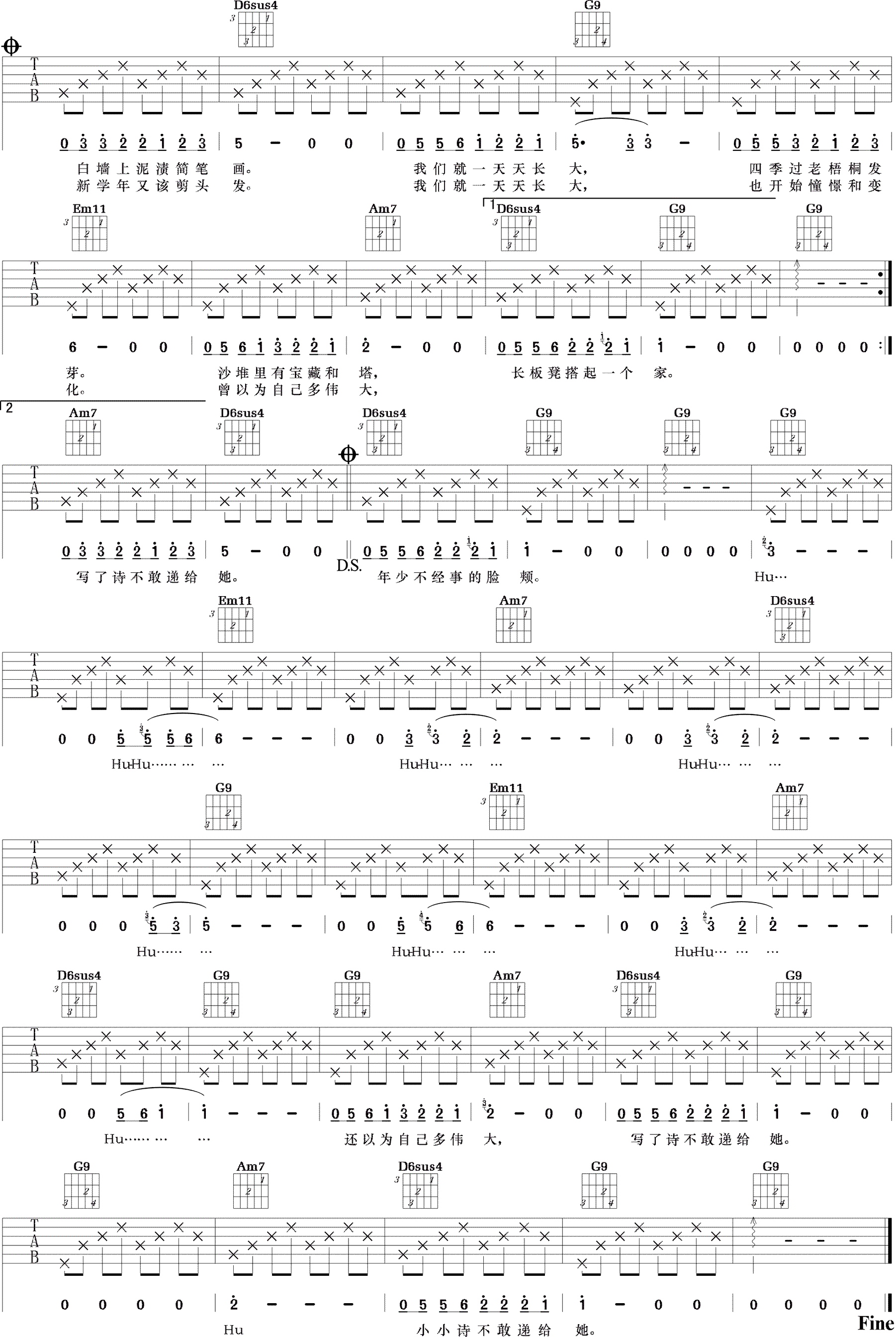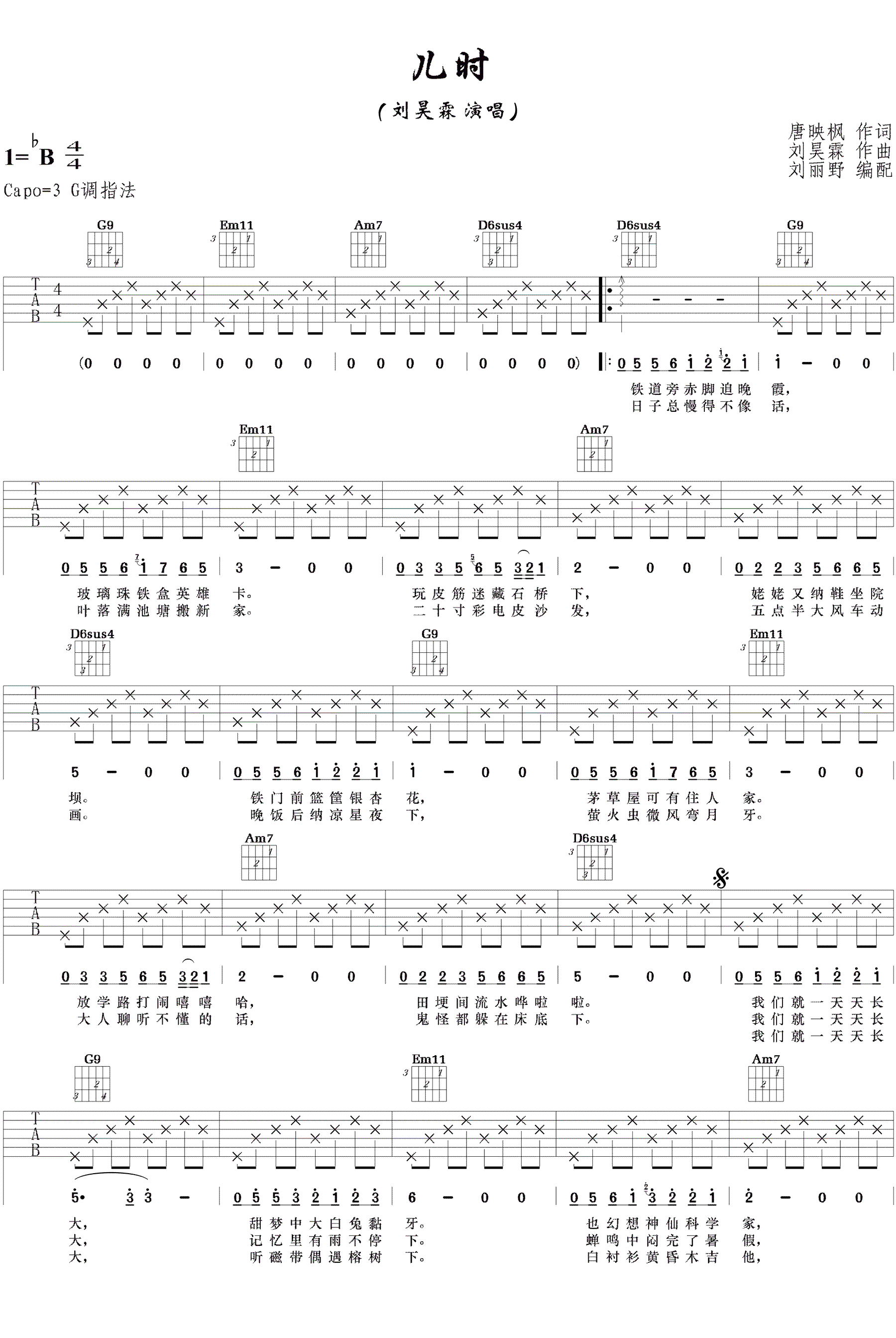 曲谱介绍: 刘昊霖《儿时》吉他谱,G调指法,Capo夹三品,一首充满童趣情怀的吉他弹唱民谣歌曲,儿时六线谱,高清图片谱,感谢吉他小野编配,91吉他谱网站上传。