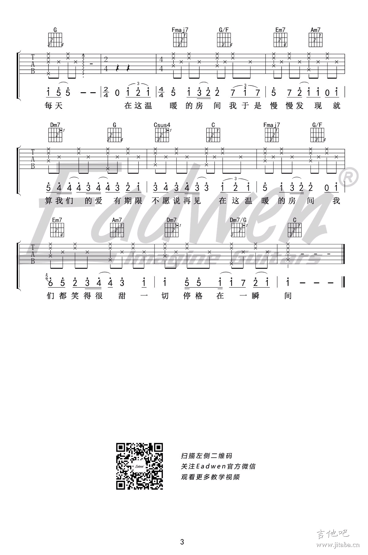 曲谱介绍: 刘瑞琦《房间》吉他谱,原调E,选调C,变调夹夹三品。每个房间都有秘密,每个房间都有主题曲。在你孤单的时候,在你耳边响起,安抚你莫名的失落;或在开心的时候,提醒你记住着美好的时光。刘瑞琦献唱电影《超时空同居》插曲《房间》,将友情、爱情的感悟提炼成一首美好的旋律,撩动人心。 房间六线谱,高清图片谱,爱德文吉他教室编配出品,91吉他谱网站上传。 吉他弹唱教学视频: