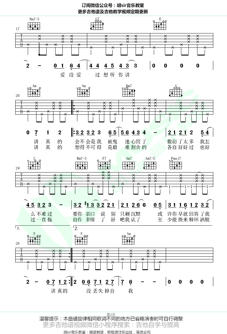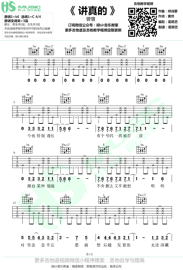 曲谱介绍: 曾惜《讲真的》吉他谱,原调bE,选调C,变调夹夹三品。朗朗上口的好听旋律,让人忍不住单曲循环的抖音热门歌曲。讲真的六线谱,吉他弹唱图片谱,感谢胡sir音乐教室出品,91吉他谱网站上传推荐。 清新而又略带伤感的情歌,跃动的节奏感,如彼此的心跳声般,将恋爱中相互喜欢而又不确定的纯真情感完美的呈现了出来,让人深有共鸣。