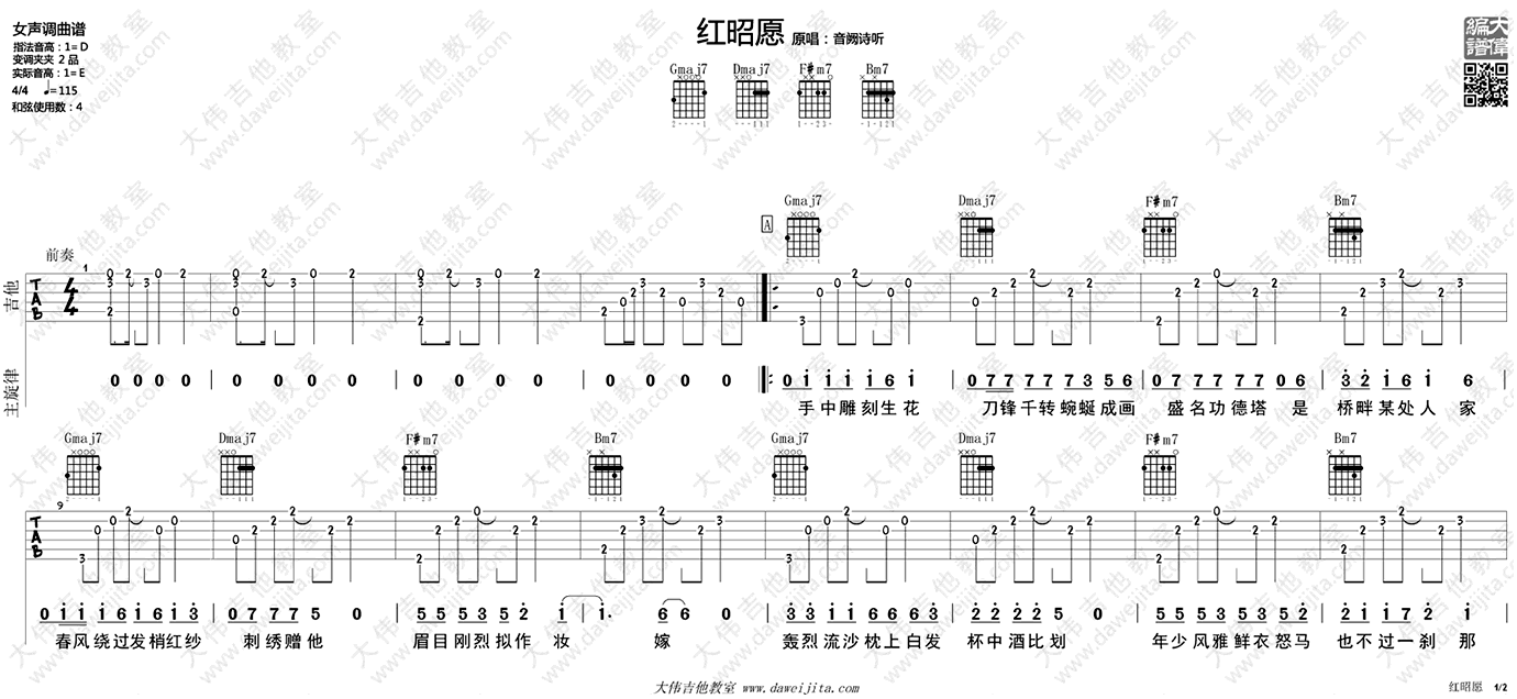 曲谱介绍: 音阙诗听《红昭愿》吉他谱,女生调曲谱,指法音高D,变调夹夹第二品,实际音高E,和弦使用数只有4个。一首红遍抖音平台,让人心醉神迷的古风歌曲。红昭愿六线谱,点击图片可以浏览高清图片谱,感谢大伟吉他教室出品,91吉他谱网站上传推荐。随谱附上大伟老师吉他演奏、美女小丽演唱的示范视频,琴友们配合曲谱练习起来吧。