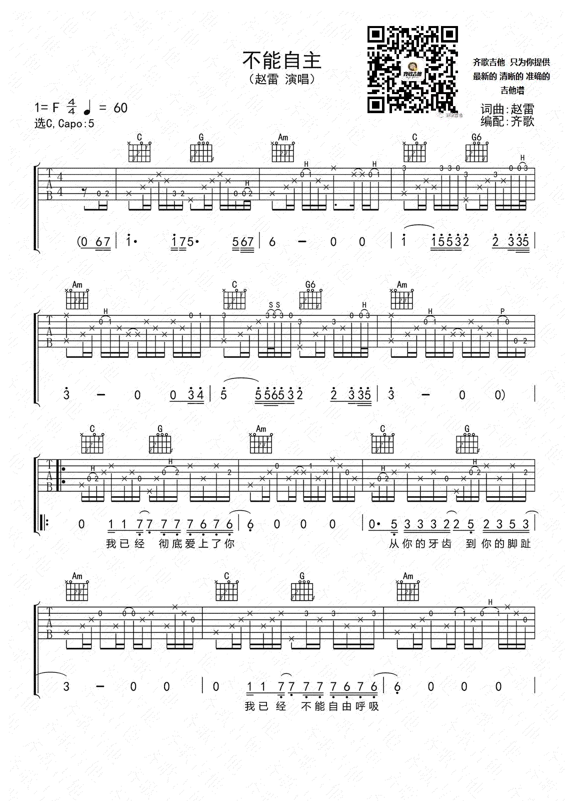曲谱介绍: 赵雷《不能自主》吉他谱,选用C调指法,Capo夹五品。不能自主六线谱,高清弹唱谱共四张图片谱例,这是根据现场版编的,大家实际弹奏的时候,可以稍灵活机动些。感谢齐歌老师编配出品。 这首歌曲网上只能找到现场视频,是赵雷在某个酒吧的演出,虽然画面不甚清晰,但却依然魅力十足,歌声打动人心。“我已经不能自由呼吸,因为我的舌头在你的嘴里。雷子一首很“露骨”的歌曲。