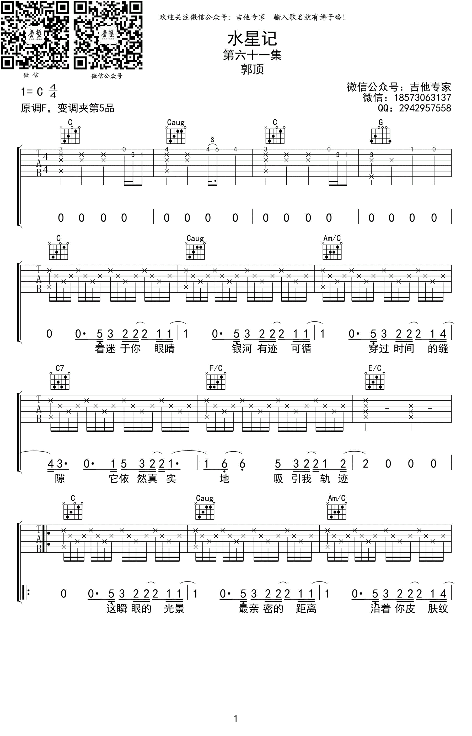 曲谱介绍: 郭顶《水星记》吉他谱,原调F调,选用C调指法编配,变调夹夹五品,水星记吉他弹唱谱,三张图片六线谱,因为原曲是钢琴伴奏,改编到了吉他里面左手的指法不好把握,和弦的色彩音相当有韵味,感谢音艺出品,91吉他谱网站上传。 这是一首需要安静聆听的歌,他会一点点唱到你心里去。我愿意,跟随你的轨迹,更愿意一直陪着你。现在抖音神曲遍地的音乐环境下,也要记得多听听这些诚意满满的作品,你才知道,音乐原来一直如此干净、美好。