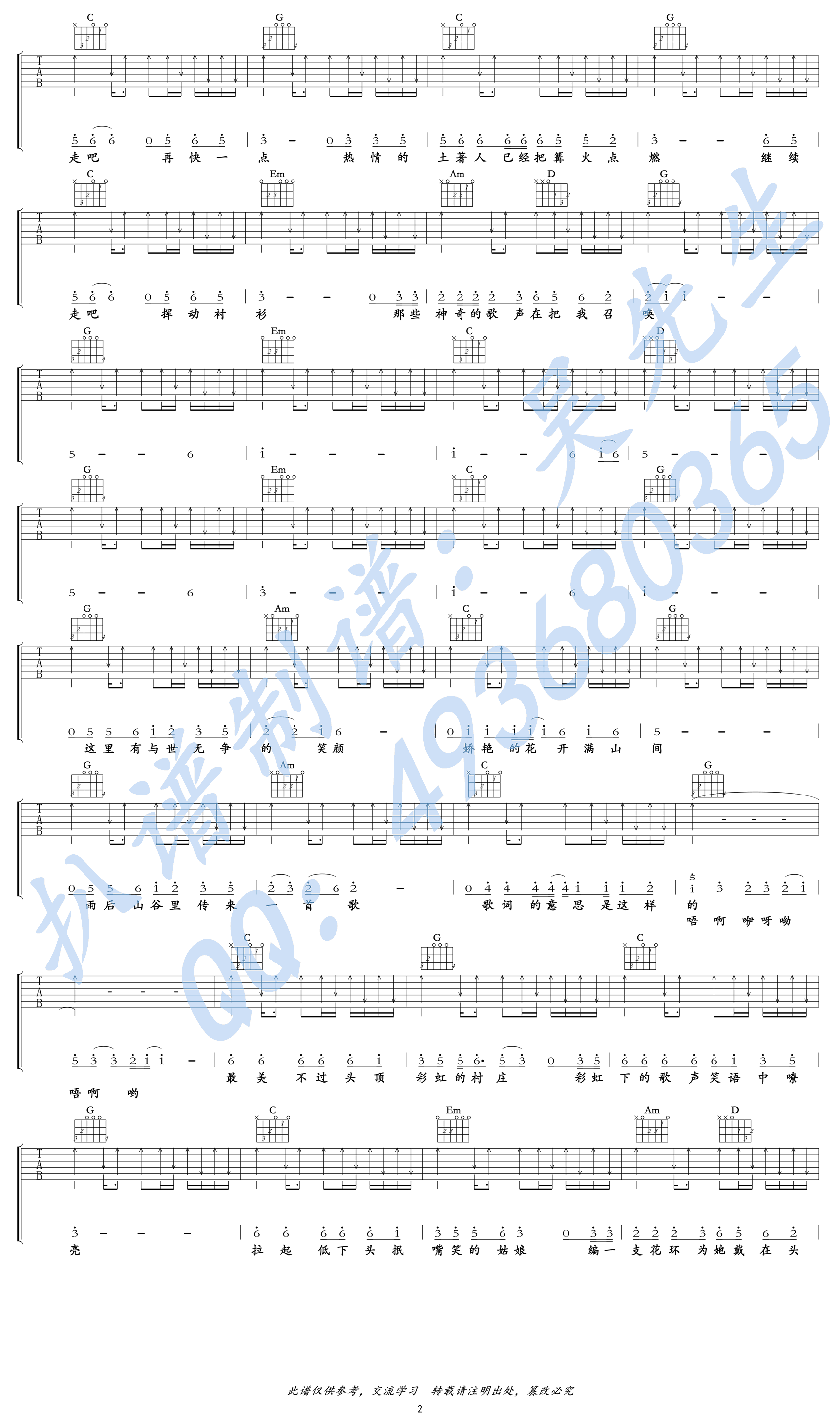 曲谱介绍: 彩虹下面吉他谱,赵雷为喜剧电影《西虹市首富》创作演唱的推广曲。彩虹下面六线谱,三张高清图片谱,歌曲原调#F,选调G,降半音调弦。感谢吴老师编配分享,91吉他谱网站上传。 一首民谣风格歌曲因融合了民族特色的音乐元素,而变得耳目一新与众不同,赵雷的歌声悠扬,唱出我们心中小时候故乡的样子,在那里有很多人在载歌载舞幸福生活,让我们每个人想起童年雨后看见彩虹的快乐回忆。