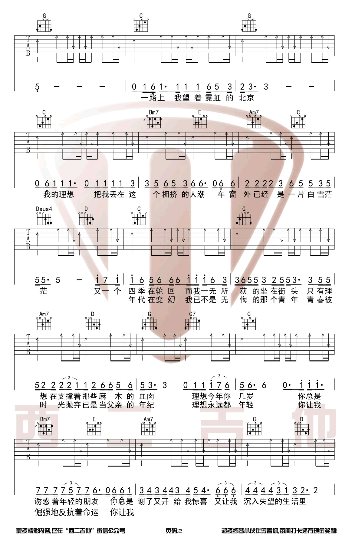 曲谱介绍: 赵雷《理想》吉他谱,G调和弦原版编配,一首很好听的民谣歌曲,理想吉他弹唱谱,三张图片六线谱,感谢西二吉他编配出品。 这首歌曲没有迷茫放弃,而是唱出理想的美好,不论人生是如何的颠沛流离,不论内心是怎样的落魄绝望,只要理想还在,生活依然能够光芒万丈。