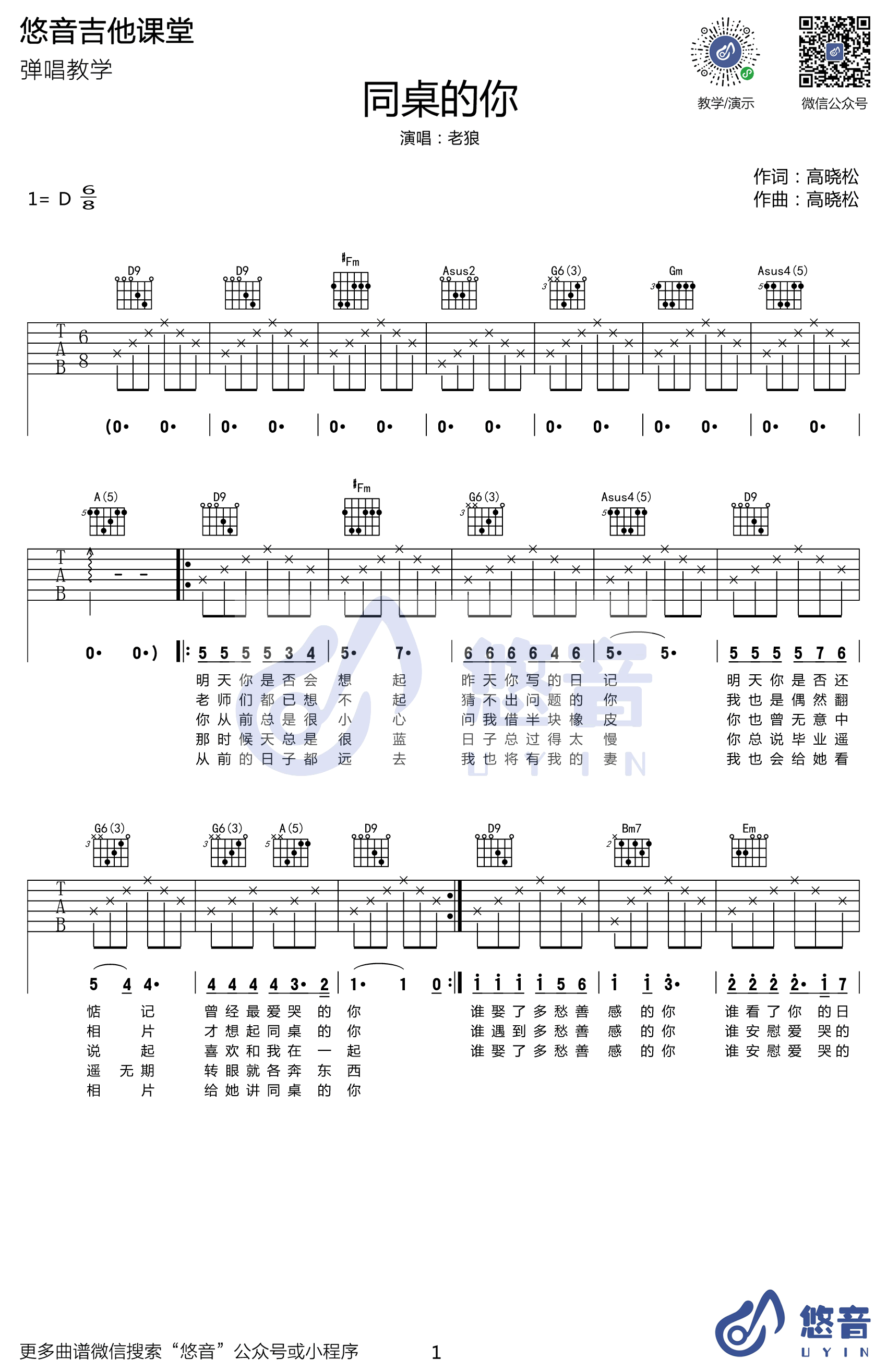 曲谱介绍: 老狼《同桌的你》吉他谱,D调指法编配,高清弹唱谱,高晓松的一首校园民谣代表作品,同桌的你六线谱,感谢悠音吉他课堂出品,随谱附上配套吉他弹唱演示视频。