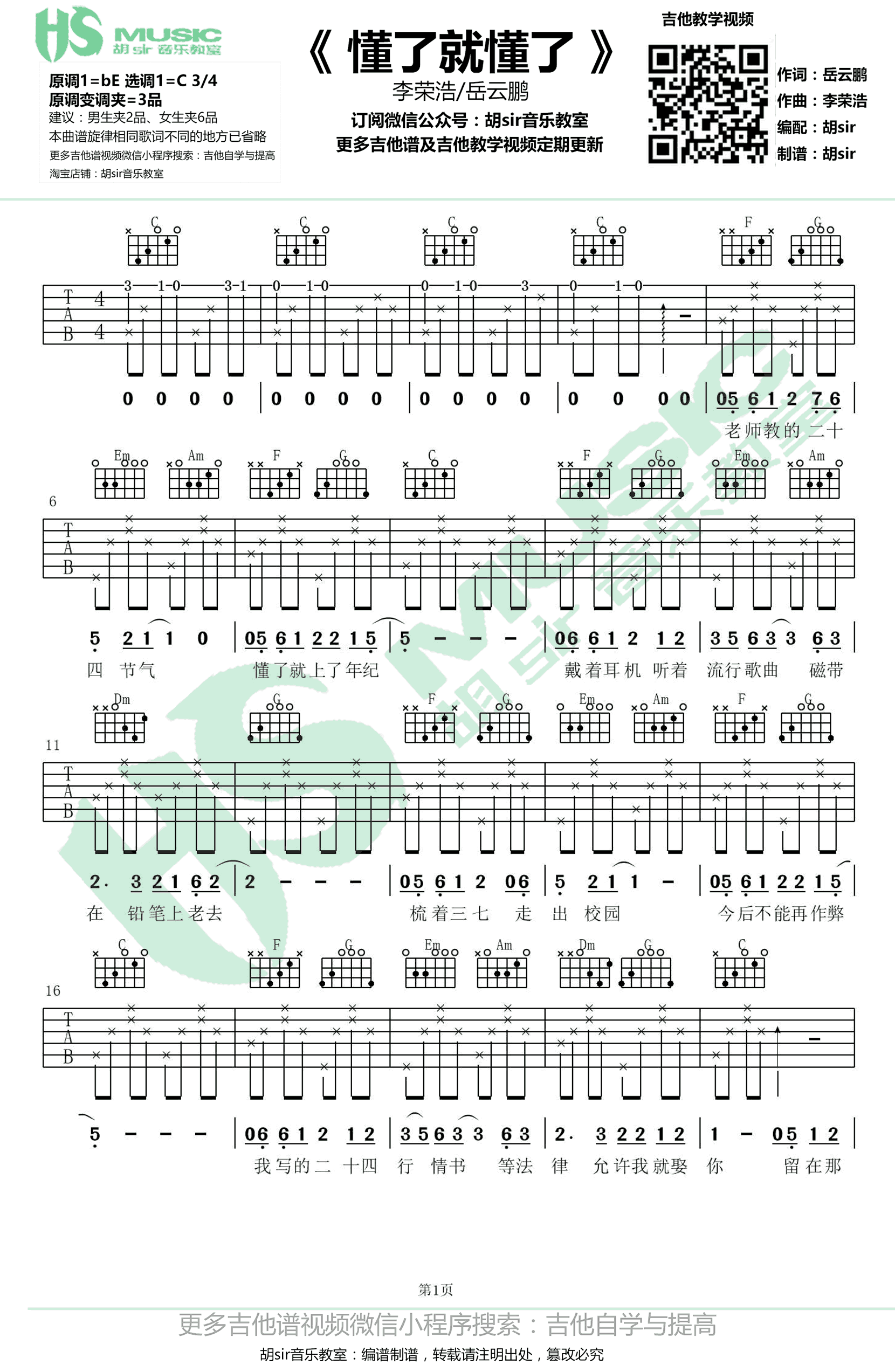 曲谱介绍: 李荣浩岳云鹏《懂了就懂了》吉他谱,原调bE,选调C,原调变调夹夹三品,无限歌谣祭的一首创作歌曲,懂了就懂了六线谱,三张图片谱高清版,感谢胡sir音乐教室出品,91吉他谱网站上传。 一首诉说青春心事的《懂了就懂了》,淡淡伤感的回忆之歌,旋律轻快,富有画面感的歌词,把我们带回到教室的桌椅中间,回到了十七岁时的青春记忆里。