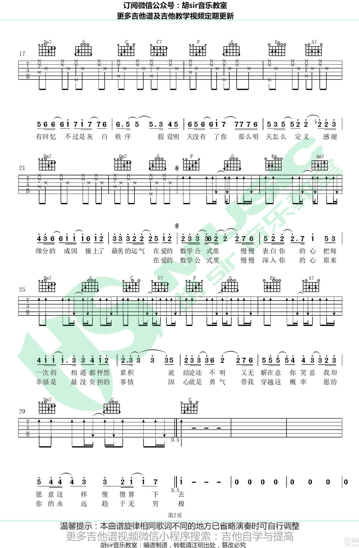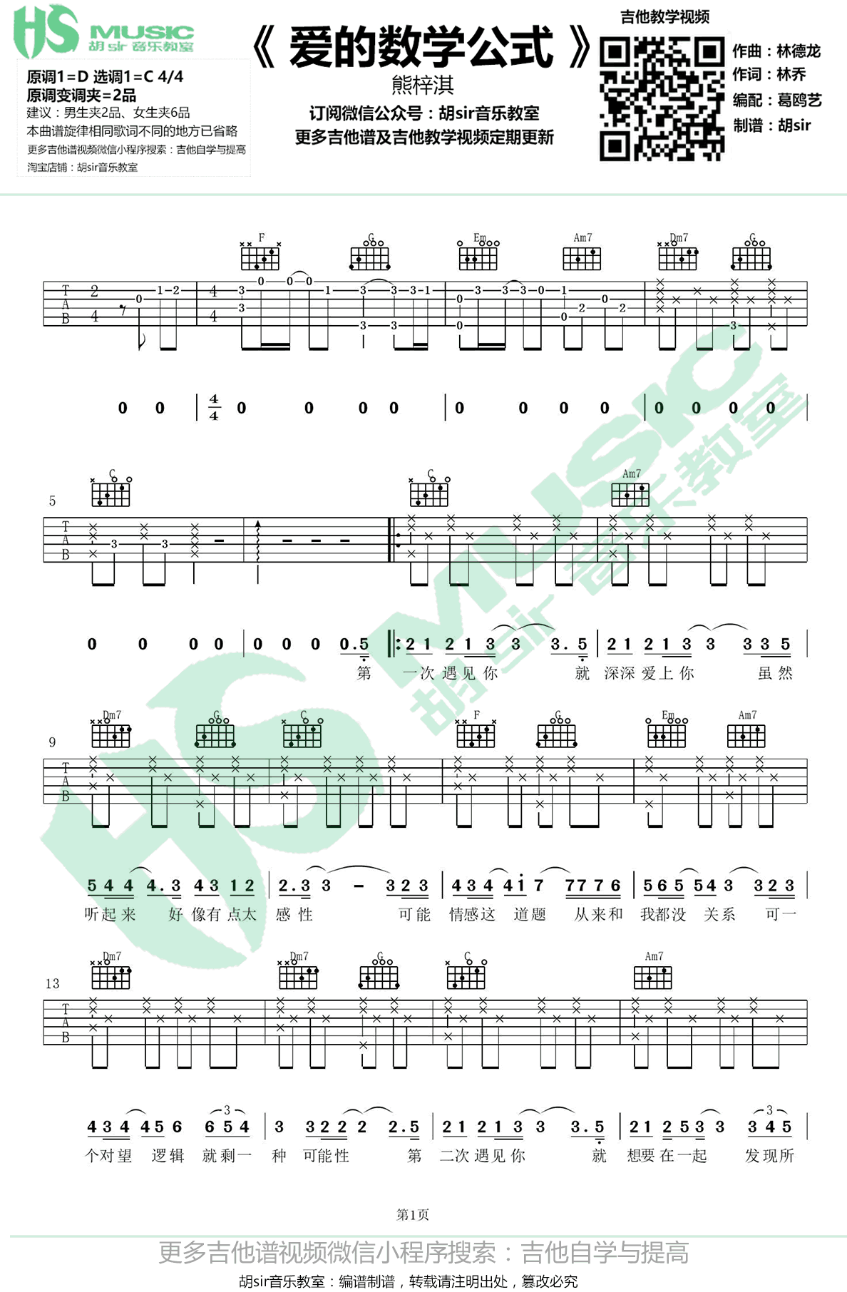 曲谱介绍: 熊梓淇《爱的数学公式》吉他谱,原调D,选调C,原调变调夹夹第二品,女生建议夹六品,爱的数学公式六线谱,网络青春校园剧《我和两个他》主题曲,胡sir音乐工作室出品,欢迎琴友们扫描关注,一起学习91吉他谱。 每一个数学公式,都是爱的符号,悦耳的琴声缓缓流动,温柔中带着些许的青涩,一首暖心的歌曲,饱含真挚的情感,让歌声变得更加坚定有力。
